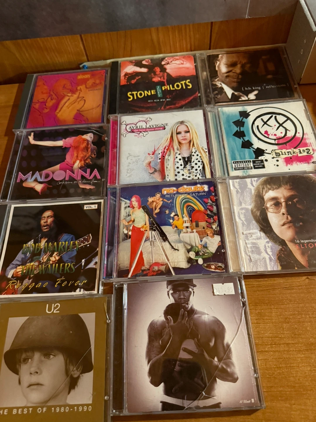 Selling a collection of CDs including artists like Stone Pilots, Avril Lavigne, Madonna, Blink-182, Bob Marley, U2, and more! Great for anyone looking to expand their music collection.