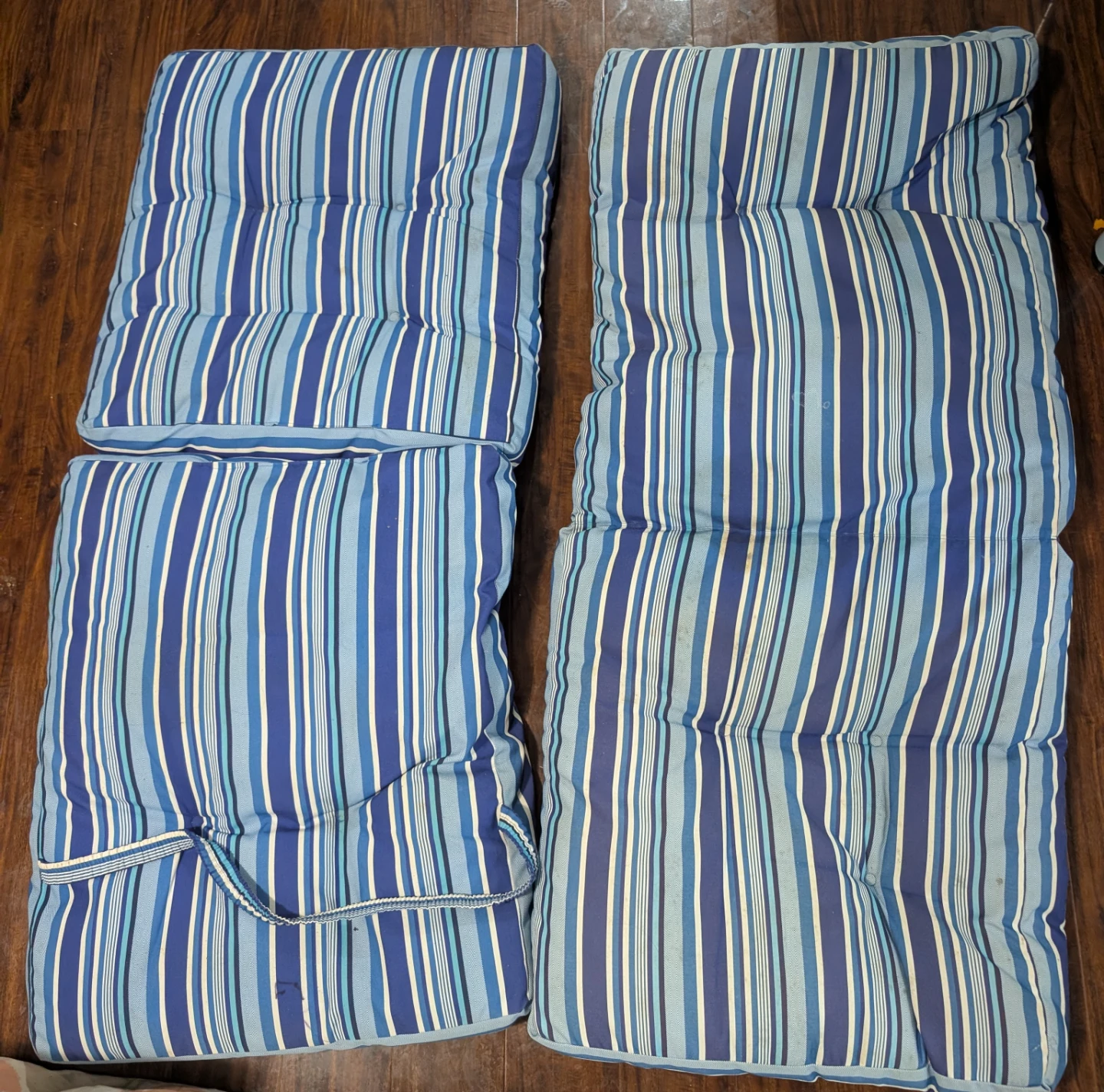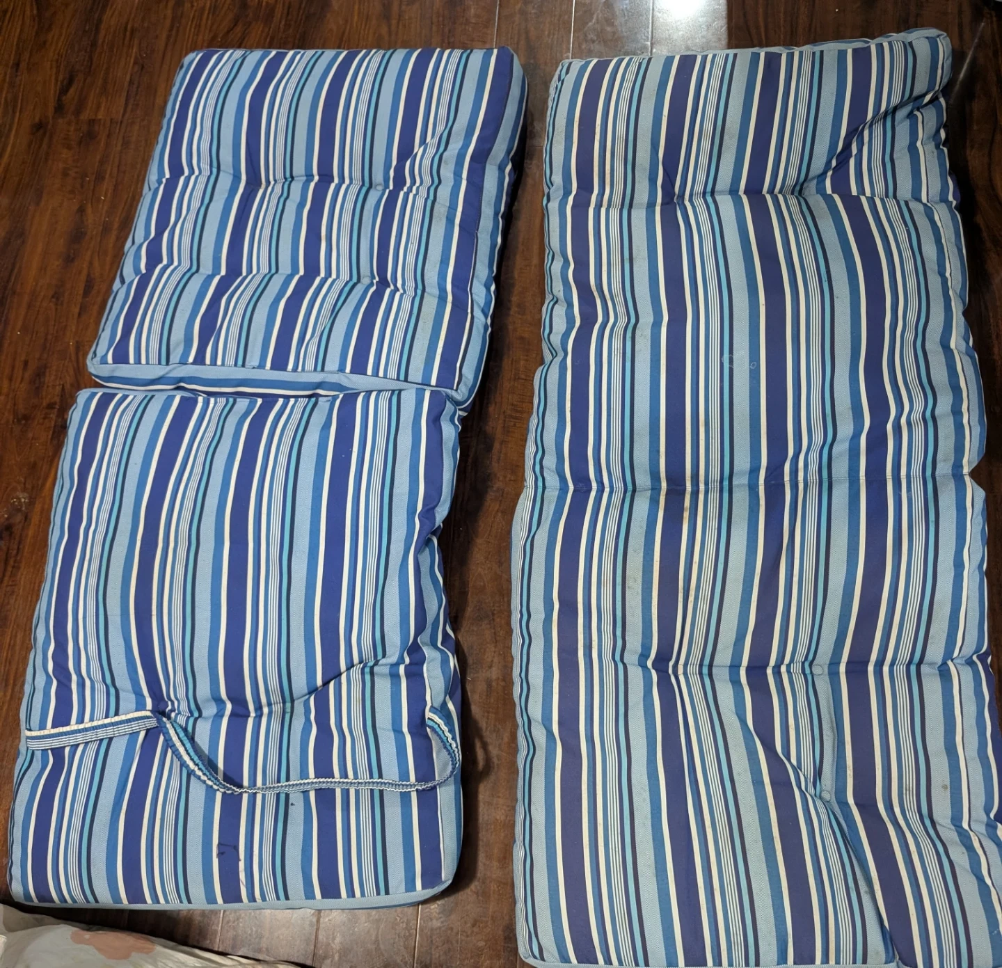 Set of outdoor chair cushions with a blue and white striped pattern. Perfect for adding comfort and style to your patio furniture!. Can be used for camping too!