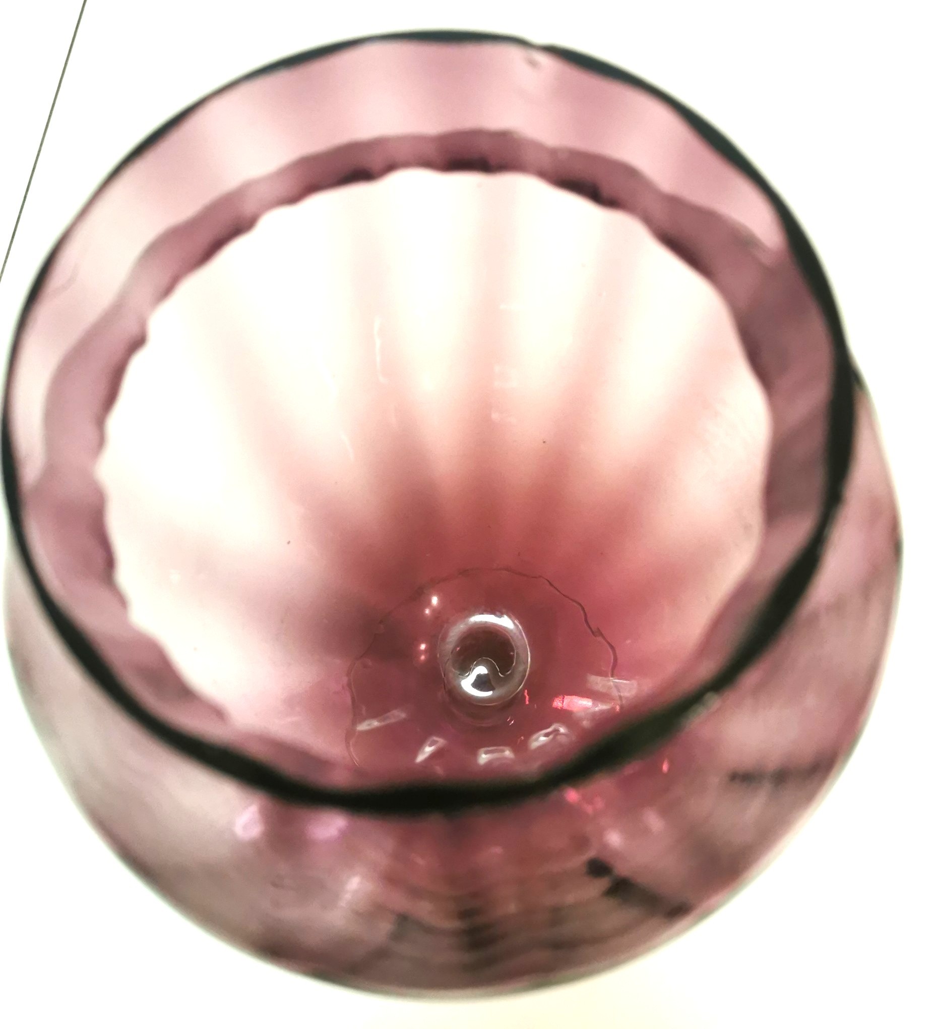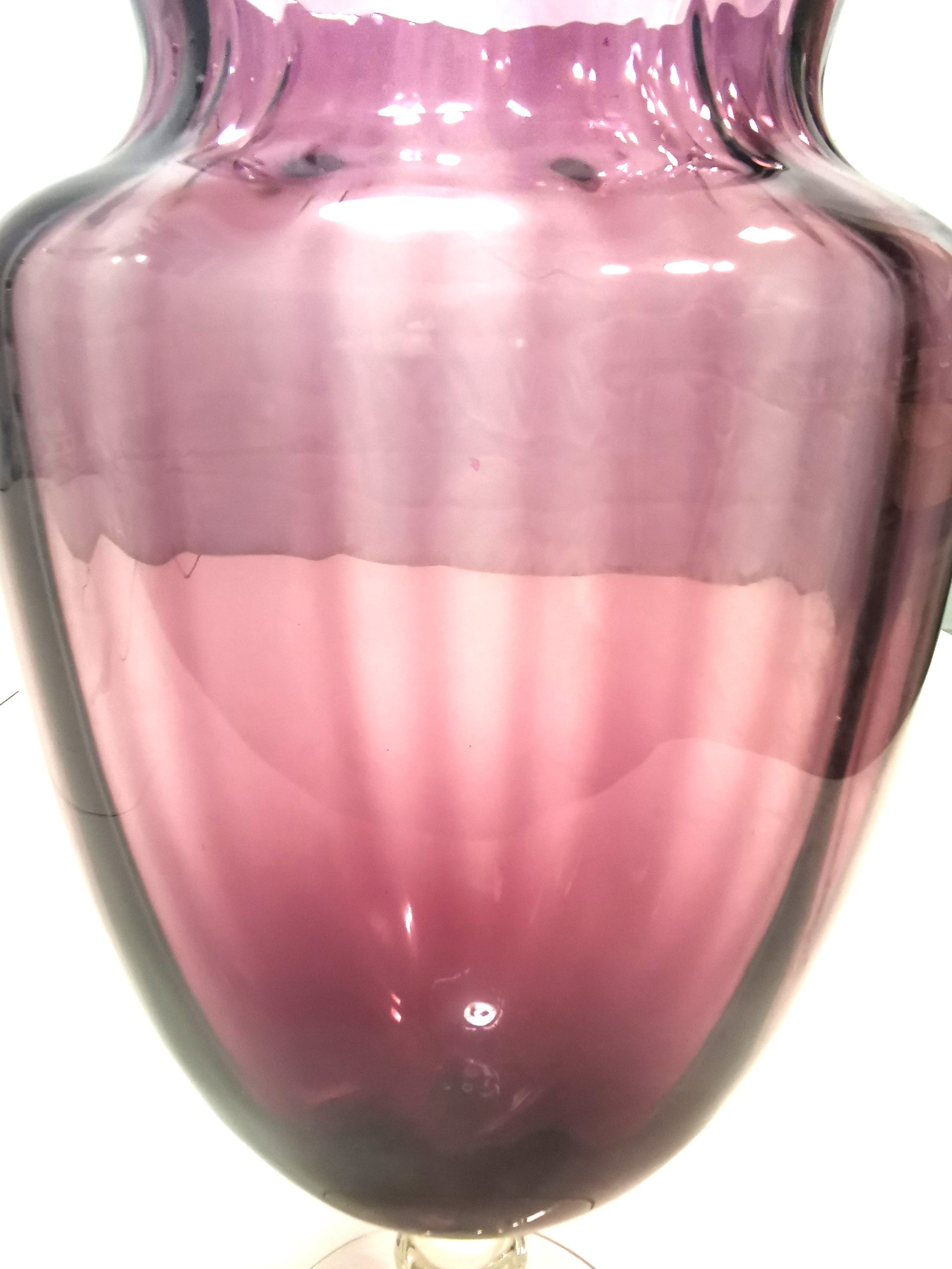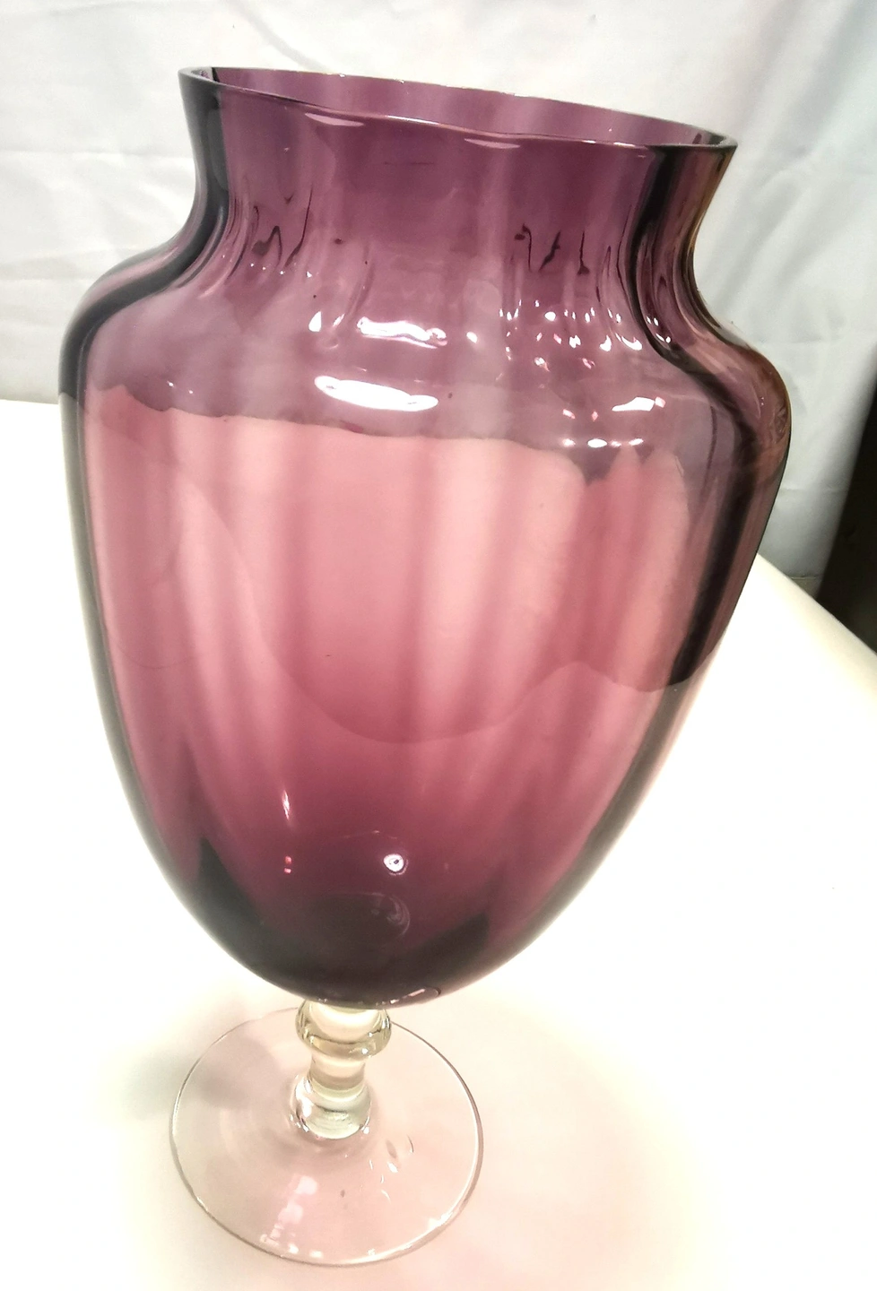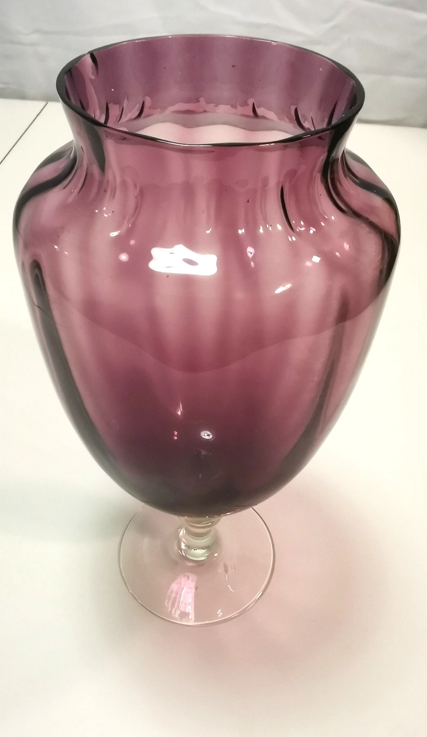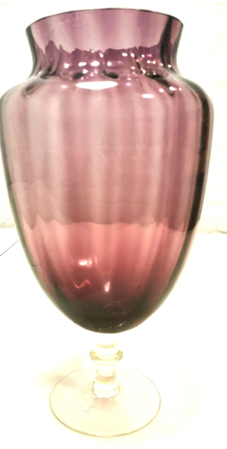 Description: Add a touch of Mid-Century Modern elegance to your home with this stunning amethyst purple art glass vase. Featuring a classic "optic rib" or "panel" design, this hand-blown piece catches the light beautifully. The deep purple body is perfectly balanced by a sturdy, clear glass pedestal foot.