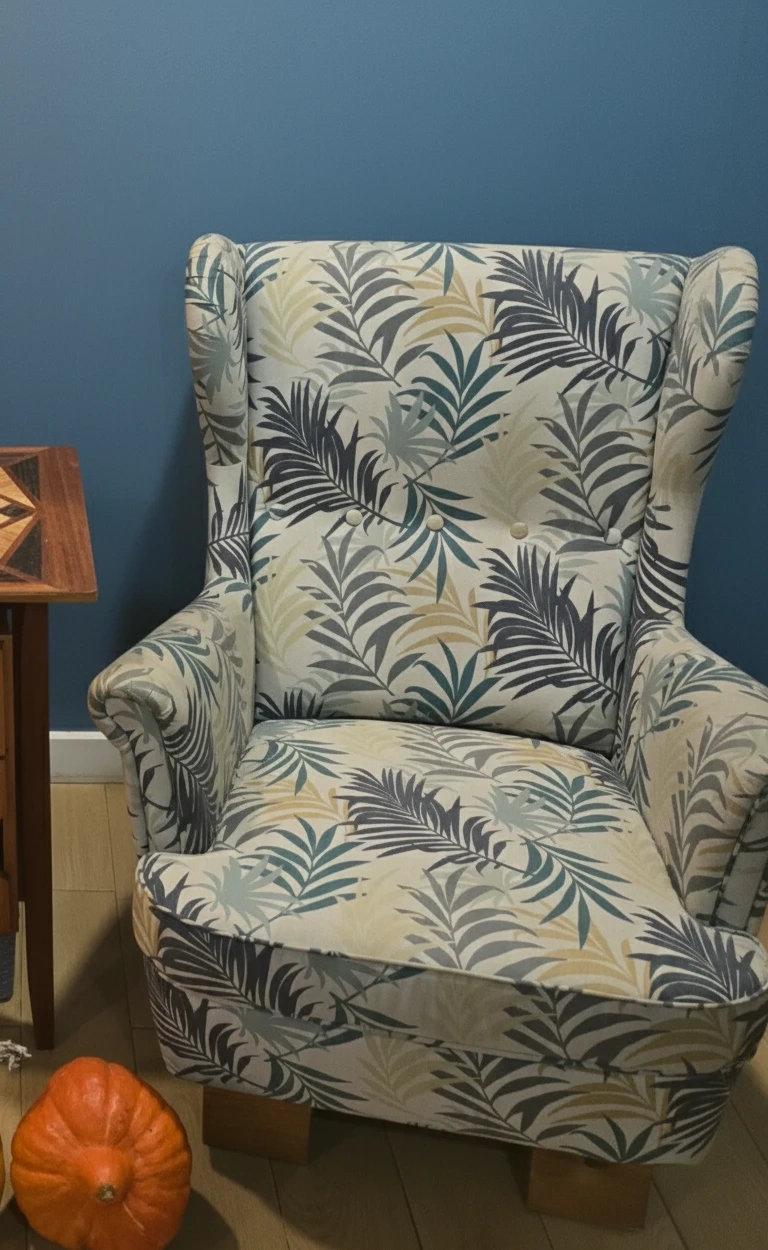 Selling a comfy wingback armchair with a cool leaf pattern! It's in great shape and would look perfect in any living room or reading nook