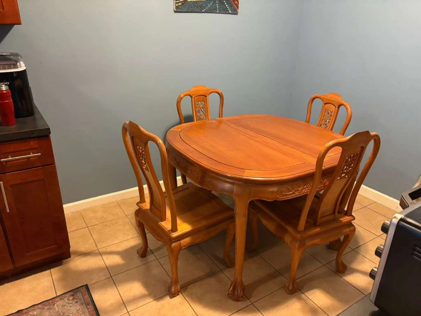 Selling a wooden dining table with four chairs. It has a unique design on the back of each chair and a beautiful finish on the table top. The set is in good condition and ready for a new home!