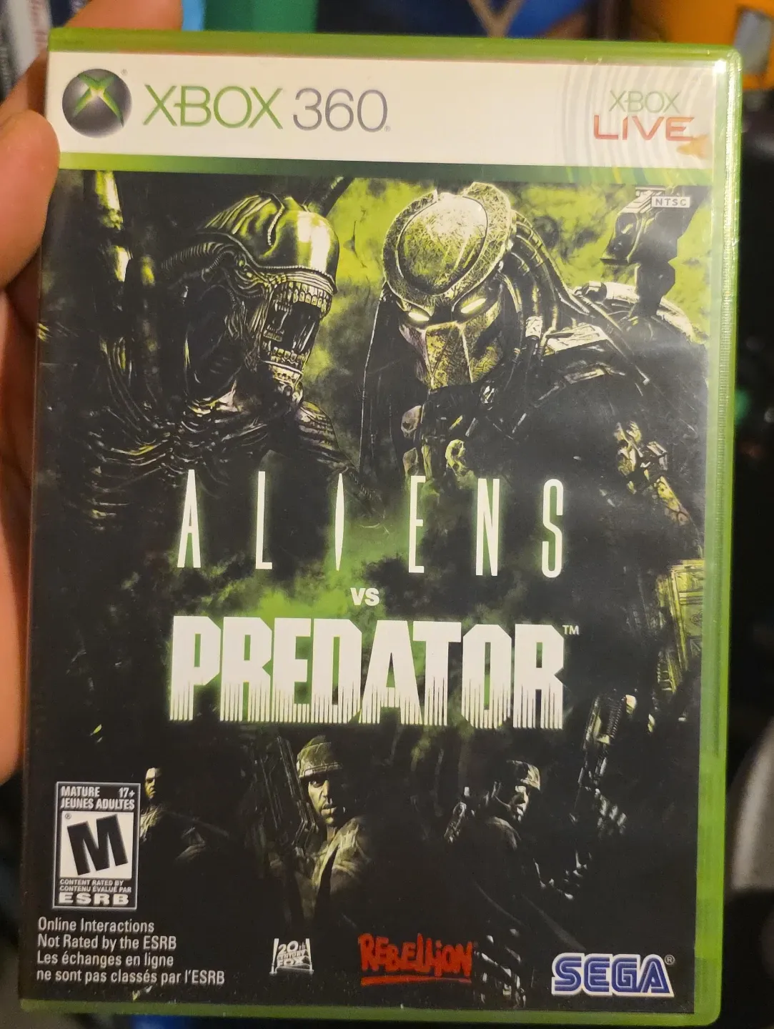 Selling the Xbox 360 game Aliens vs Predator. Rated Mature 17+ by the ESRB. Enjoy online interactions with this classic game!