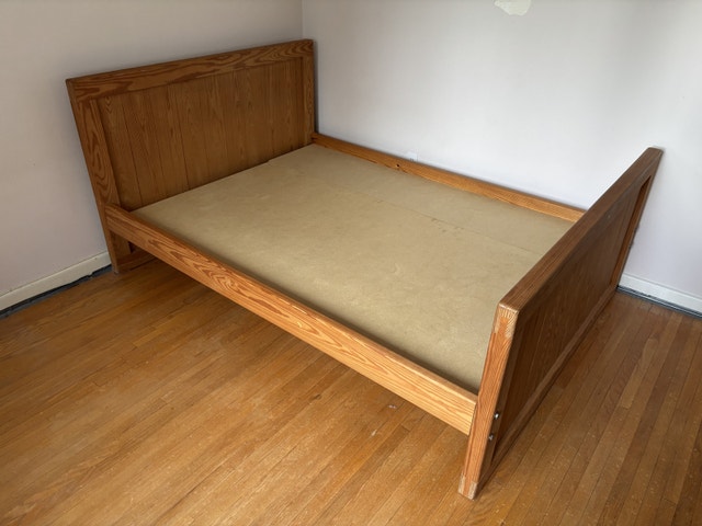 Moving sale! Double (full) size bed frame. It doesn’t need a box spring because of the foundation wood. Already disassembled. You may pick it up at Stonebridge Public School at 16th and McCowan. Cheers!