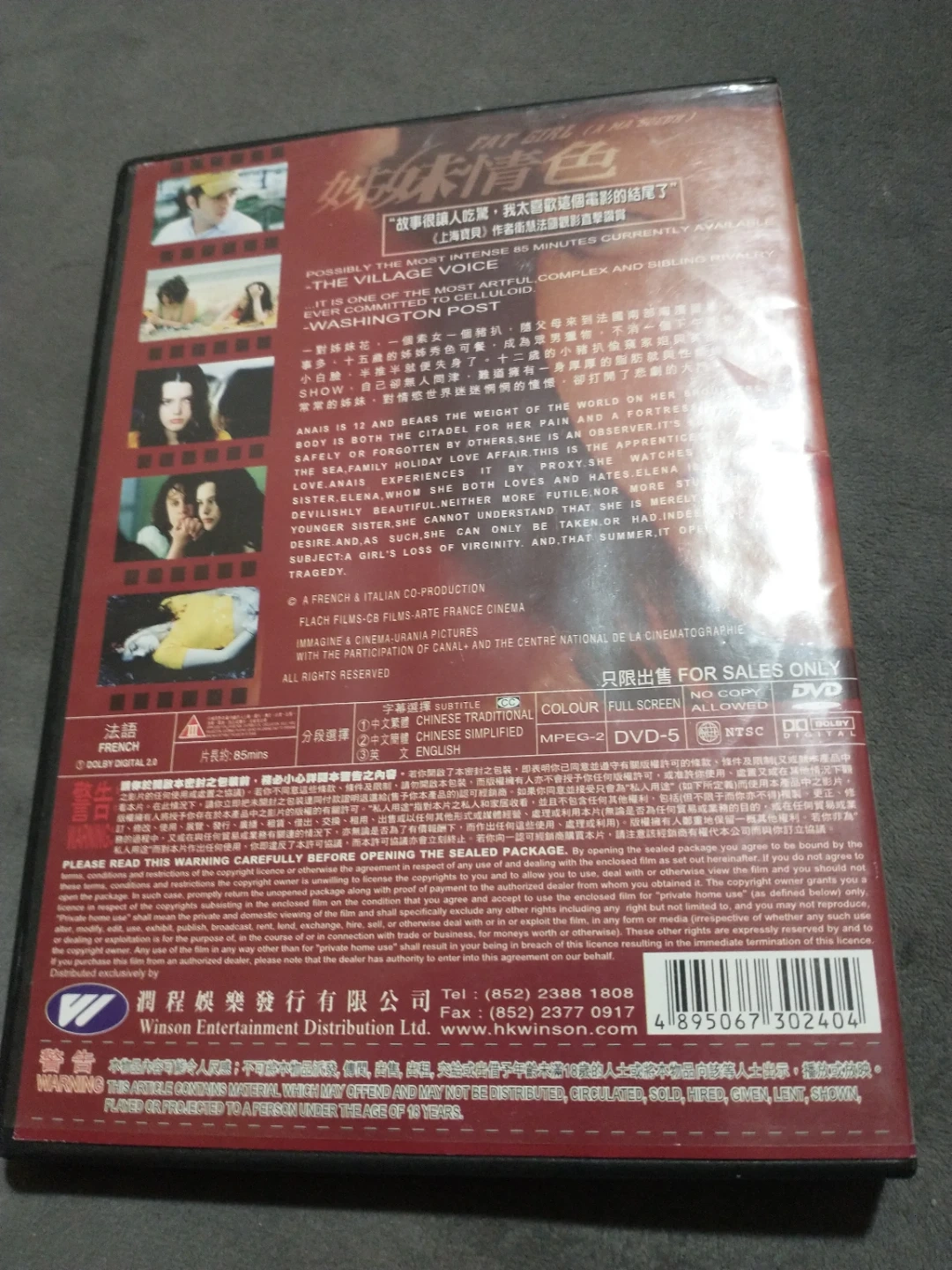 Fat Girl (original title: À ma soeur!) pristine DVD Chinese issue. Two sisters confront their sexual attitudes and experiences while on a family holiday. By infamous French feminist director Catherine Breillat whose works focus on the degradation of women, and who once said at a press conference that if she were a man, the French government charge her as a pornographer.
