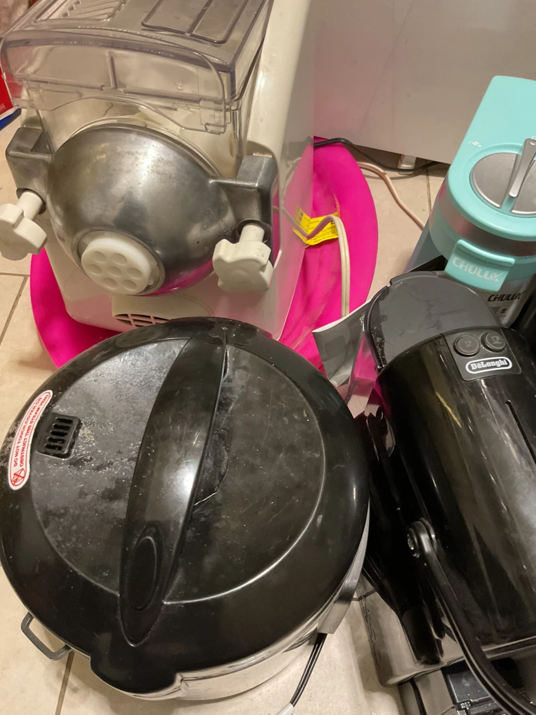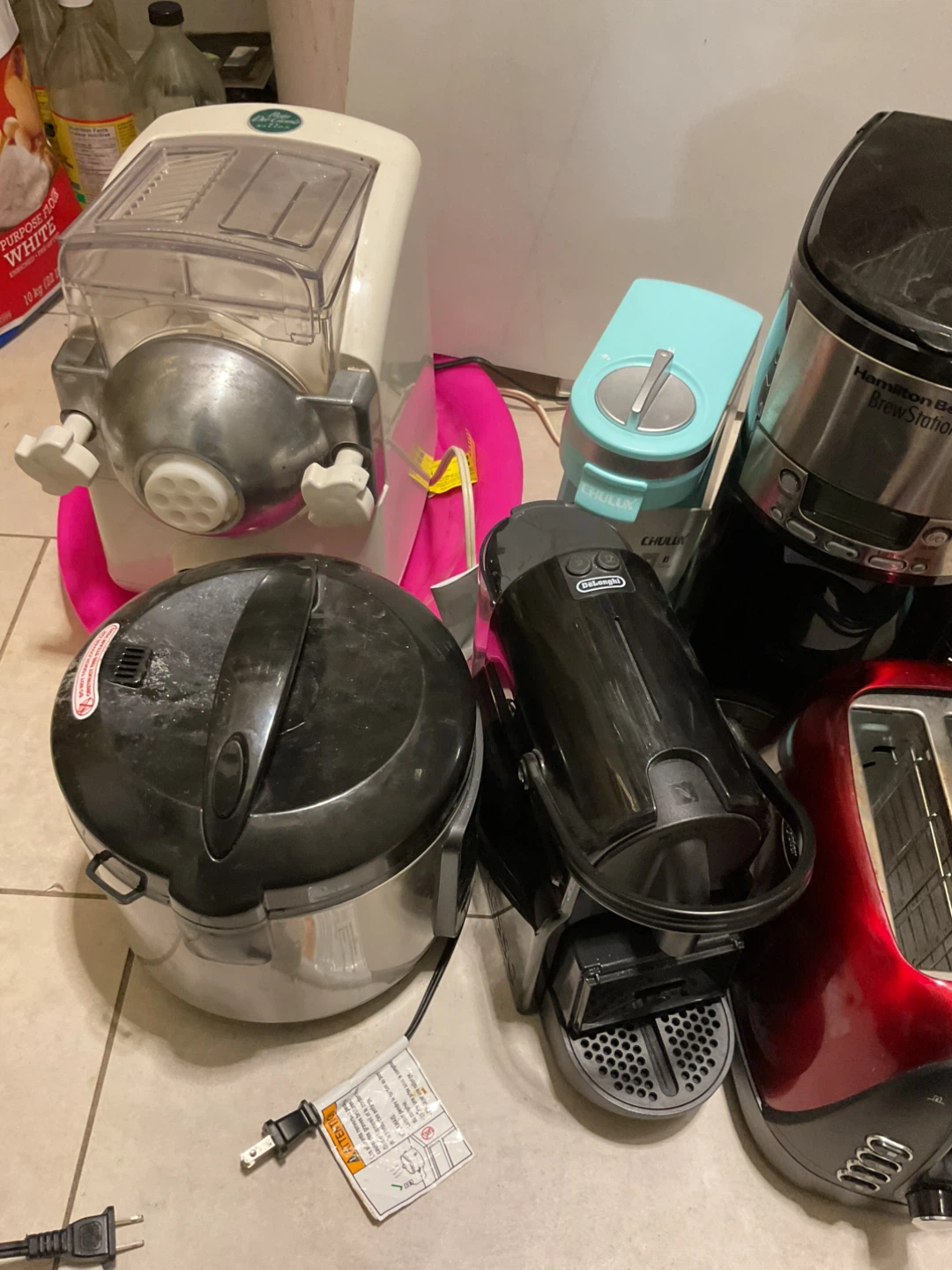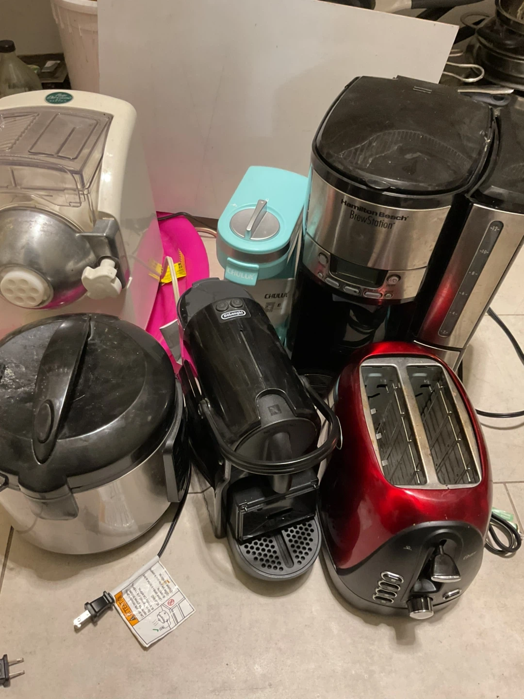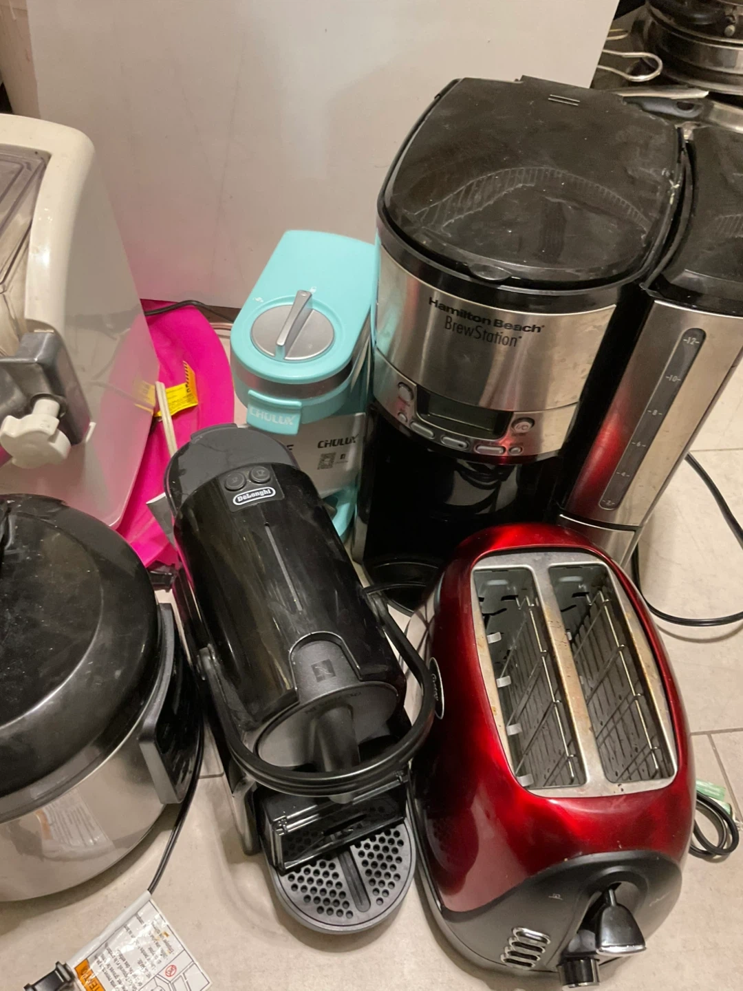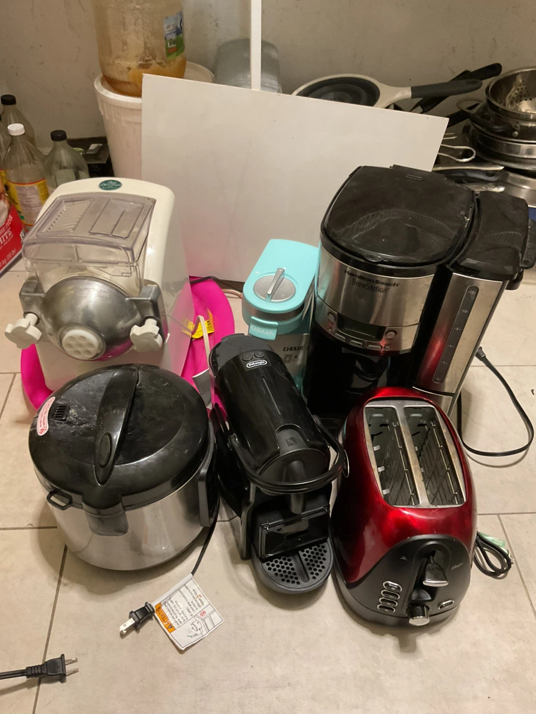 Selling a variety of kitchen appliances. Includes a pasta maker, a Chulux coffee maker, a Hamilton Beach BrewStation coffee maker, a toaster, a rice cooker, and a DeLonghi Nespresso machine. All items are used.