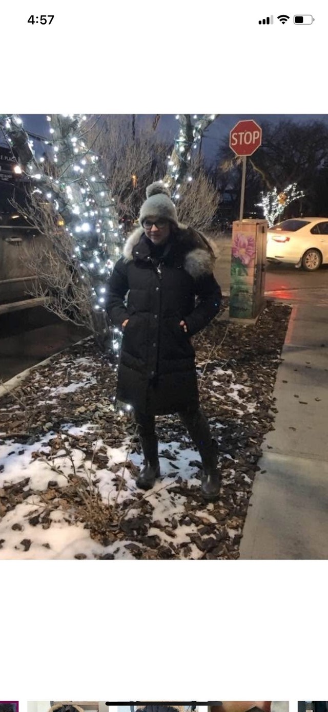 Black and silver Leather, fur trim Duster bag included! So warm! Size M Minor pulling of zipper fabric from coat at bottom & short pocket tear. Otherwise, excellent condition Barely worn! Smoke free home ! Snuggly warm! Pick up Bellevue Edmonton area