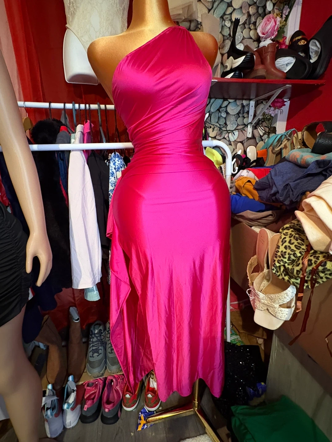 Here's a vibrant pink one-shoulder dress! It's perfect for a special occasion or a night out. The dress has a stylish asymmetrical design and a flattering silhouette. It's in great condition and ready for a new owner