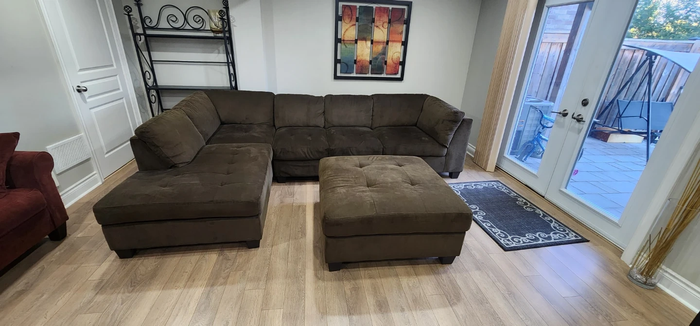 Selling a brown sectional couch with a matching ottoman. Beautiful Brown color naturally fits multiple different background. Very comfortable