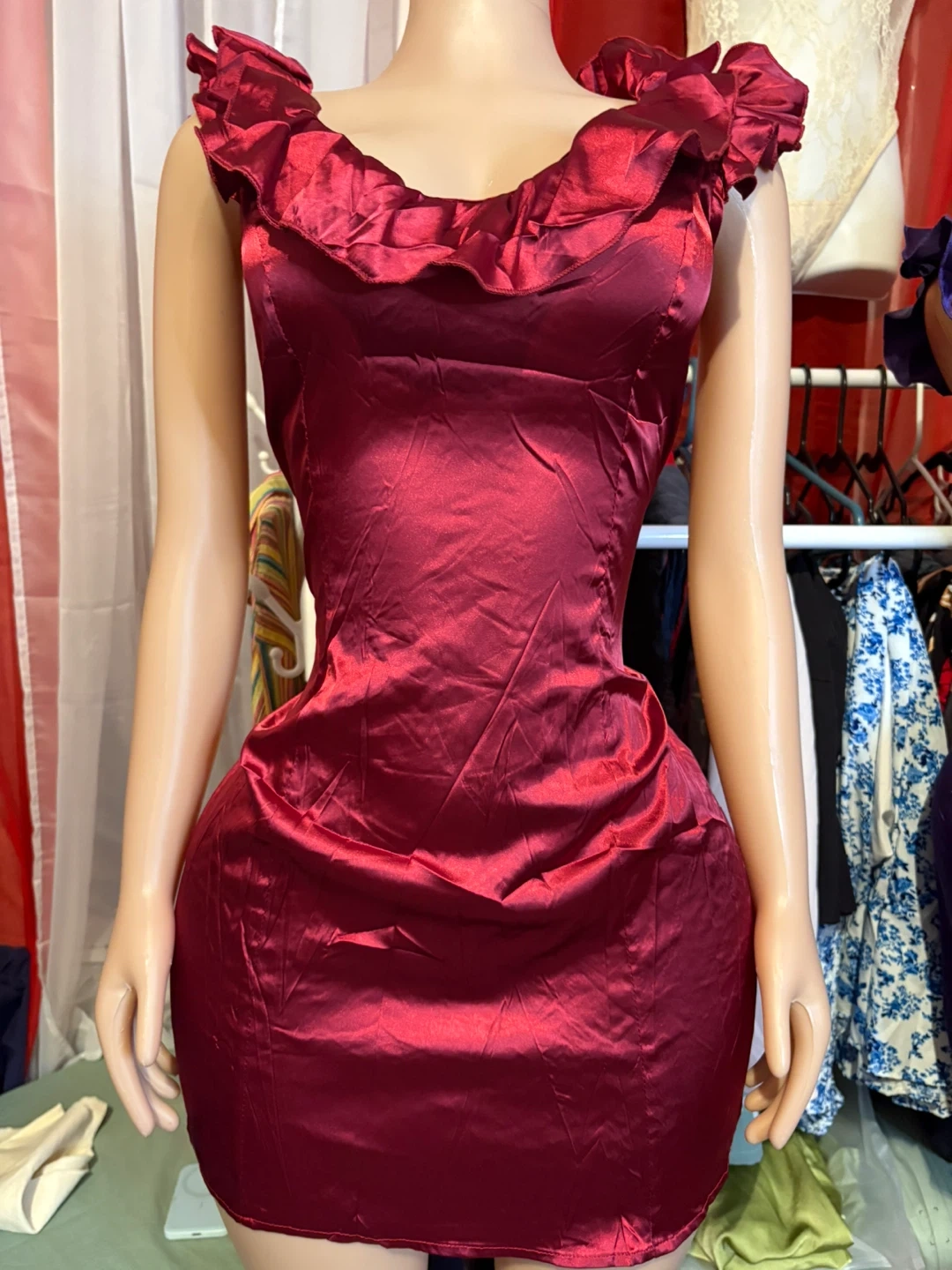 A beautiful red satin mini dress with ruffle detailing! It's a striking piece that's sure to turn heads. Perfect for a night out or a special occasion