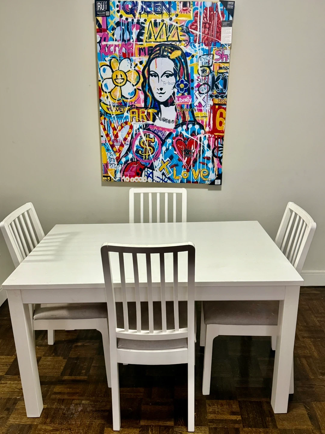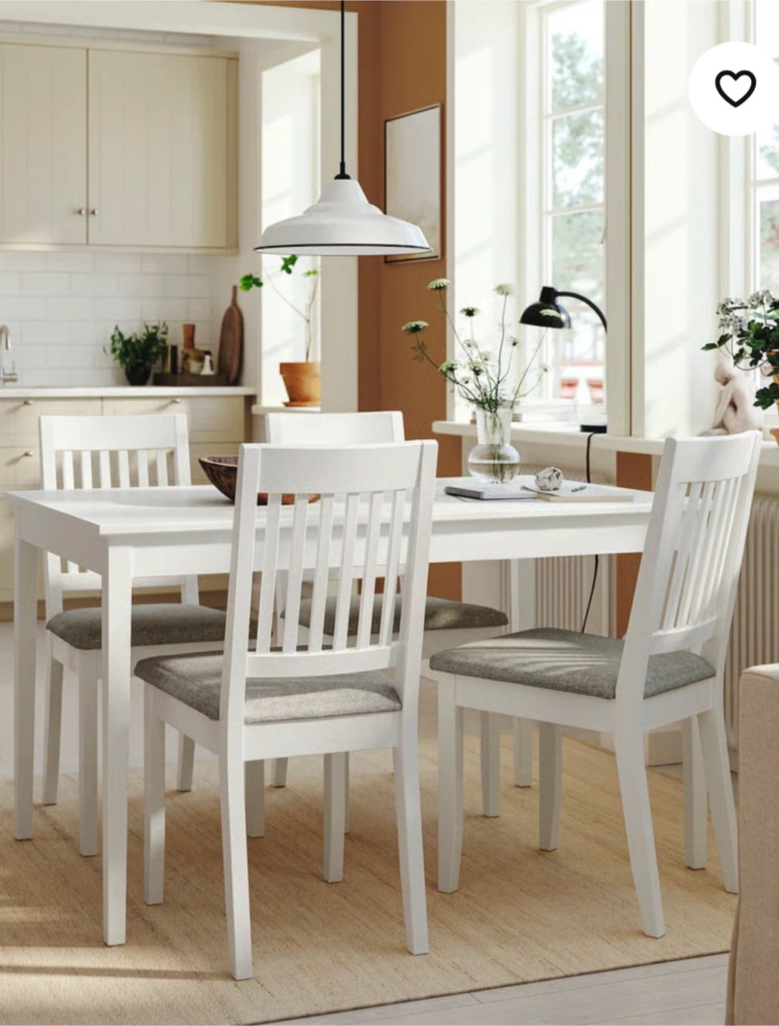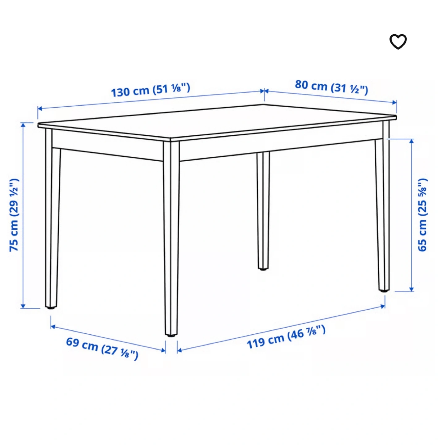Selling an IKEA extendable table with four chairs. The table is white and measures 130 cm (51 1/8") in length and 80 cm (31 1/2") in width. It's a great size for a dining area or kitchen!