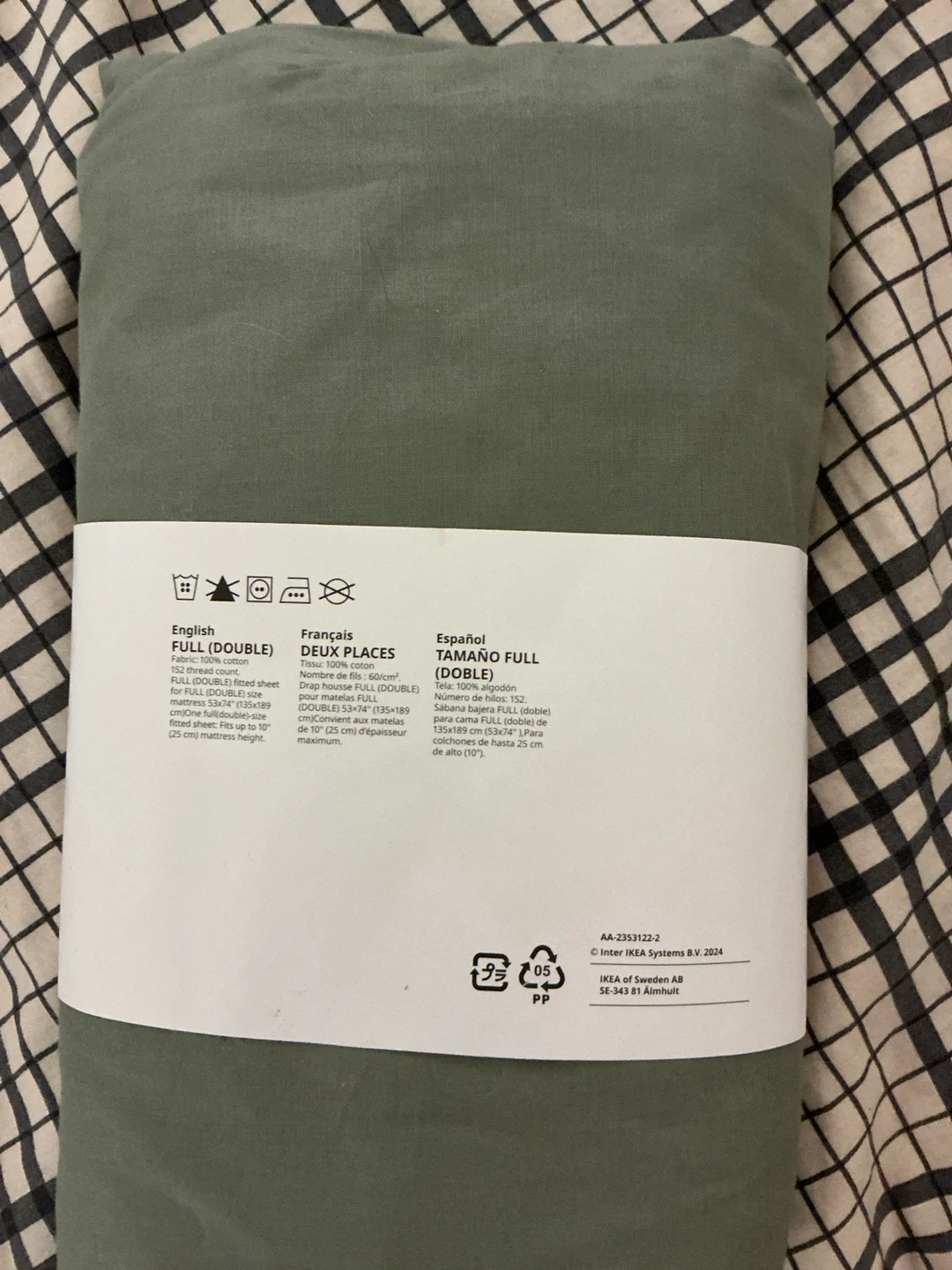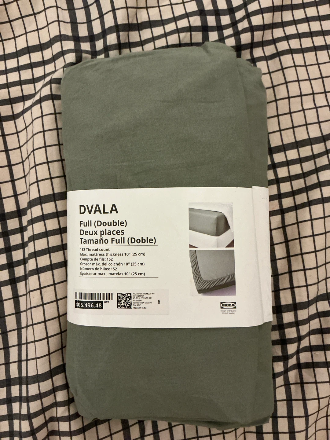 Selling a brand new IKEA DVALA fitted sheet in Full/Double size. It's a lovely olive green color and has a thread count of 152. This fitted sheet fits mattresses with a thickness of up to 10" (25 cm). The model number is 405.496.48.