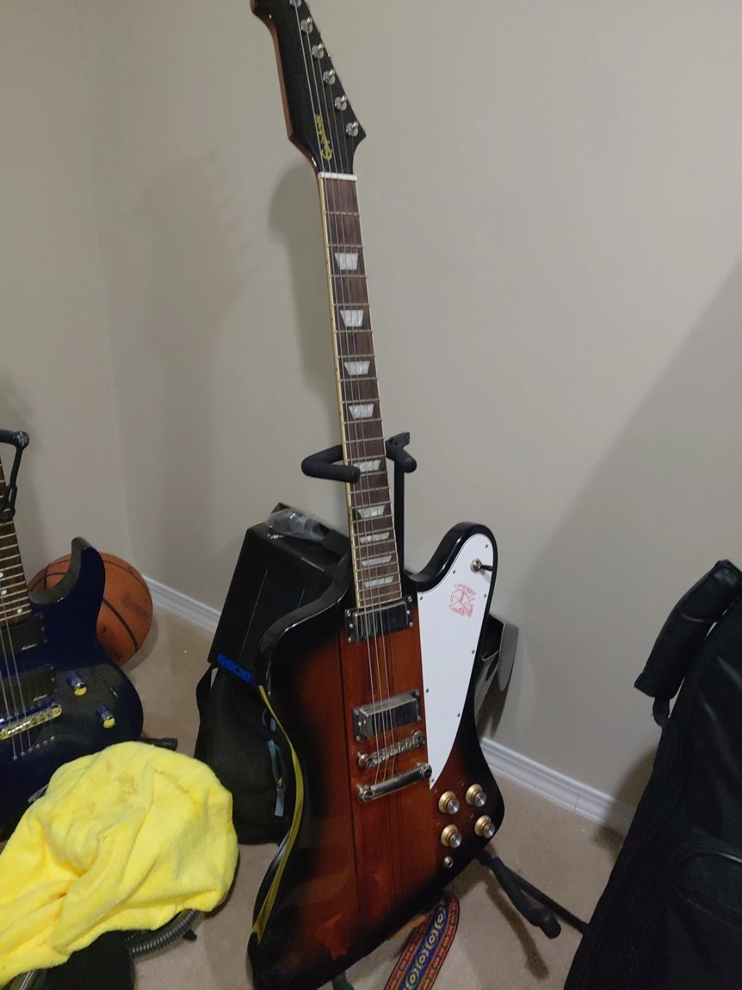 Selling an Epiphone Firebird electric guitar. It's in good condition and ready to rock! This guitar has a unique design and a powerful sound, perfect for any guitarist looking to add some flair to their collection..ive had this for only 2 months