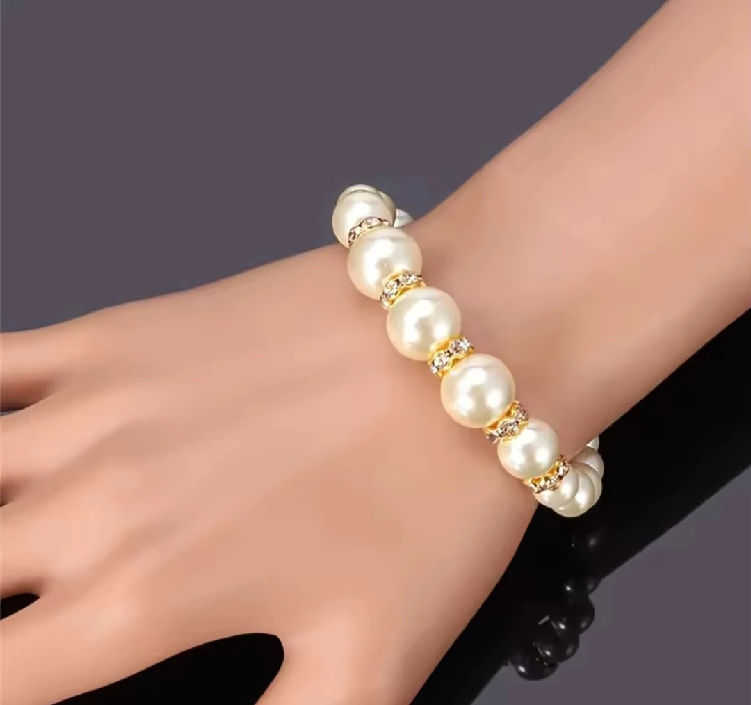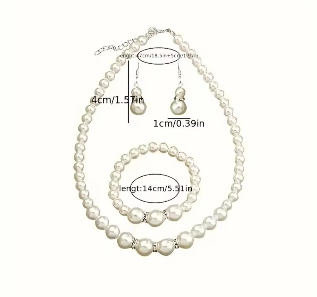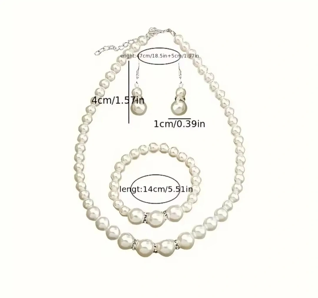 Here's a beautiful pearl jewellery set that includes a necklace, bracelet, and earrings. The bracelet is 14cm/5.51in long. The necklace and earrings are also sized appropriately to match. They're in great condition!