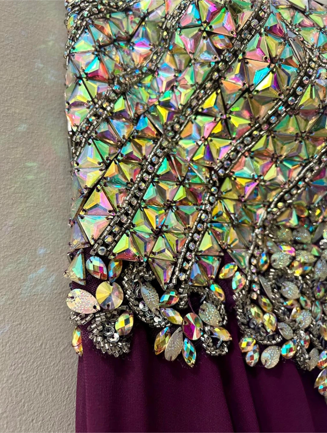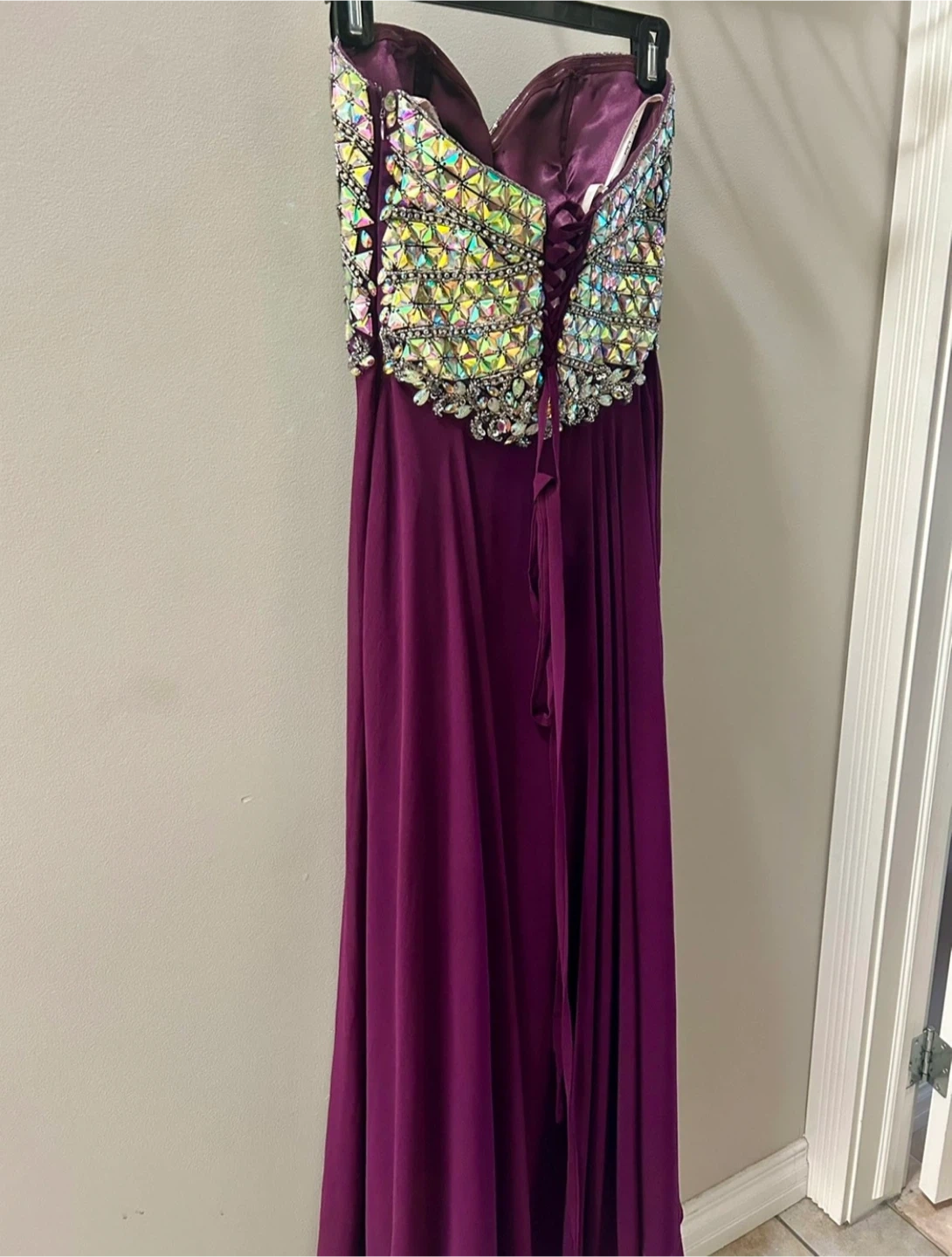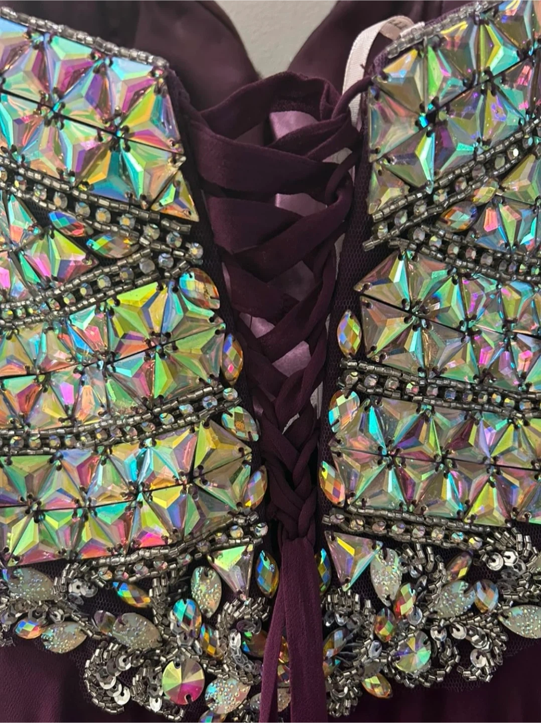 Selling a gorgeous purple prom dress with iridescent beading on the bodice. It has a corset back. In great condition!