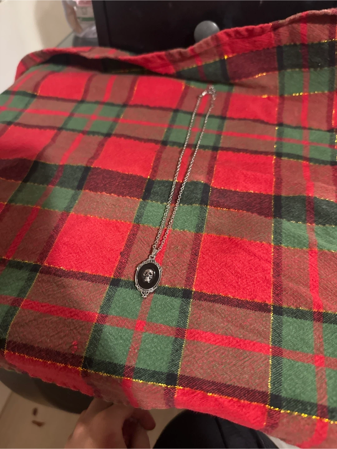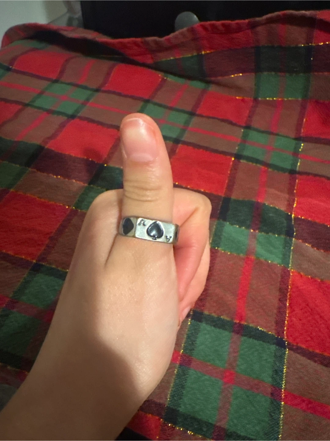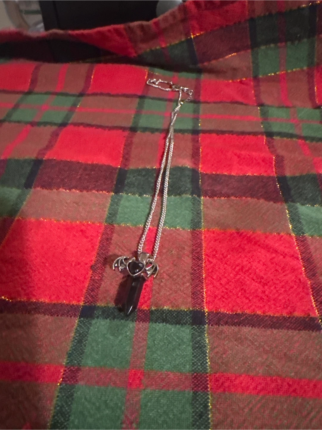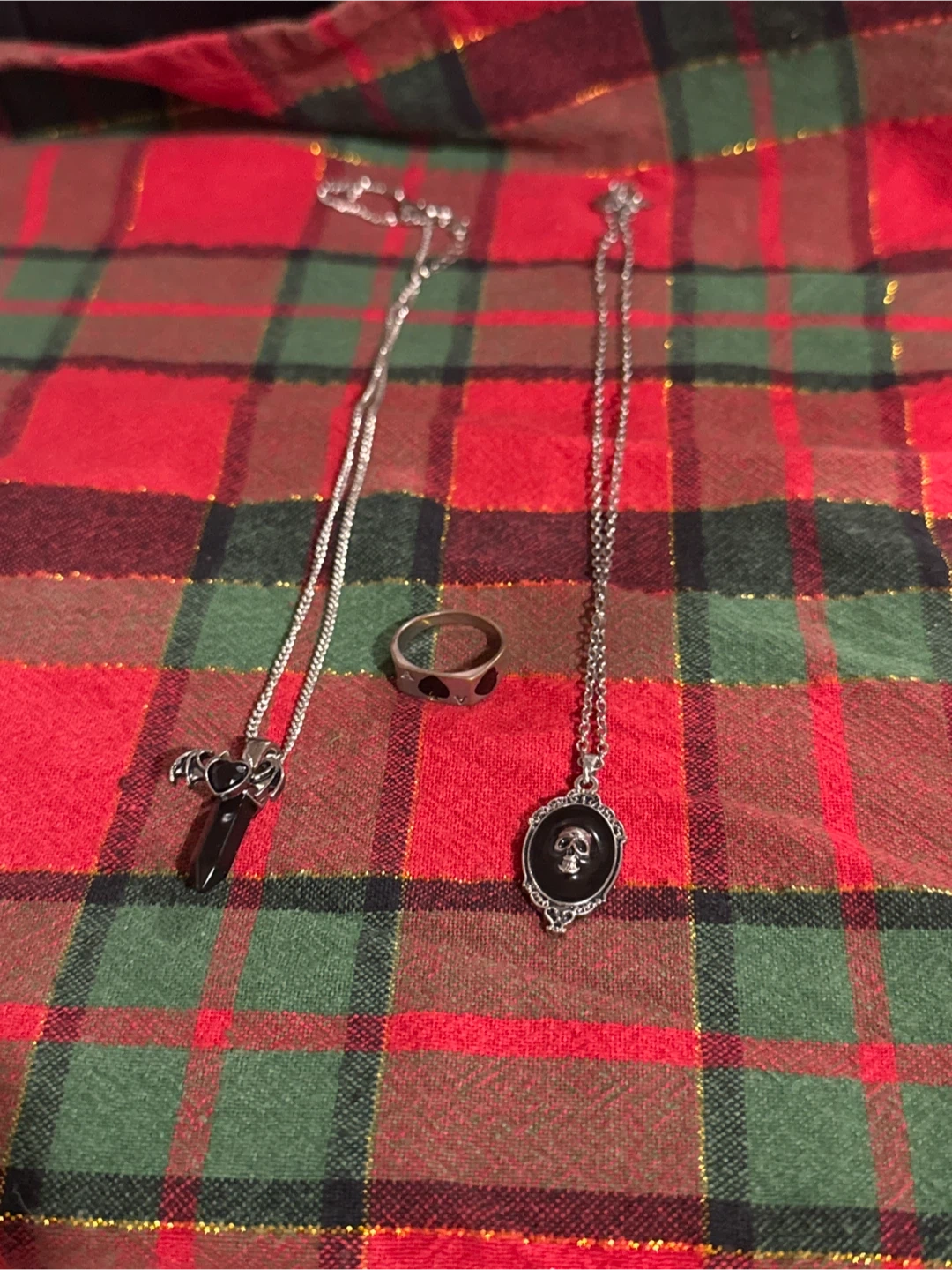 Selling a necklace and ring set. The necklace features a pendant with a bat and black stone. The ring has a spade design.
