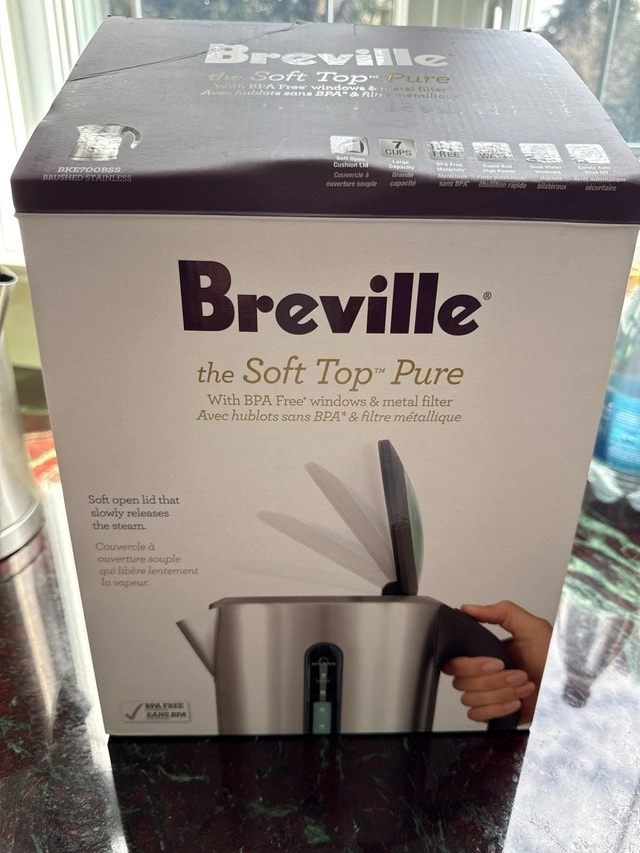 Brew a perfect cup with this Breville Soft Top Pure Kettle. This kettle features a brushed stainless steel finish, a soft-opening lid, and a BPA-free design, combining style and safety. It's in good used condition and ready to heat up your mornings!