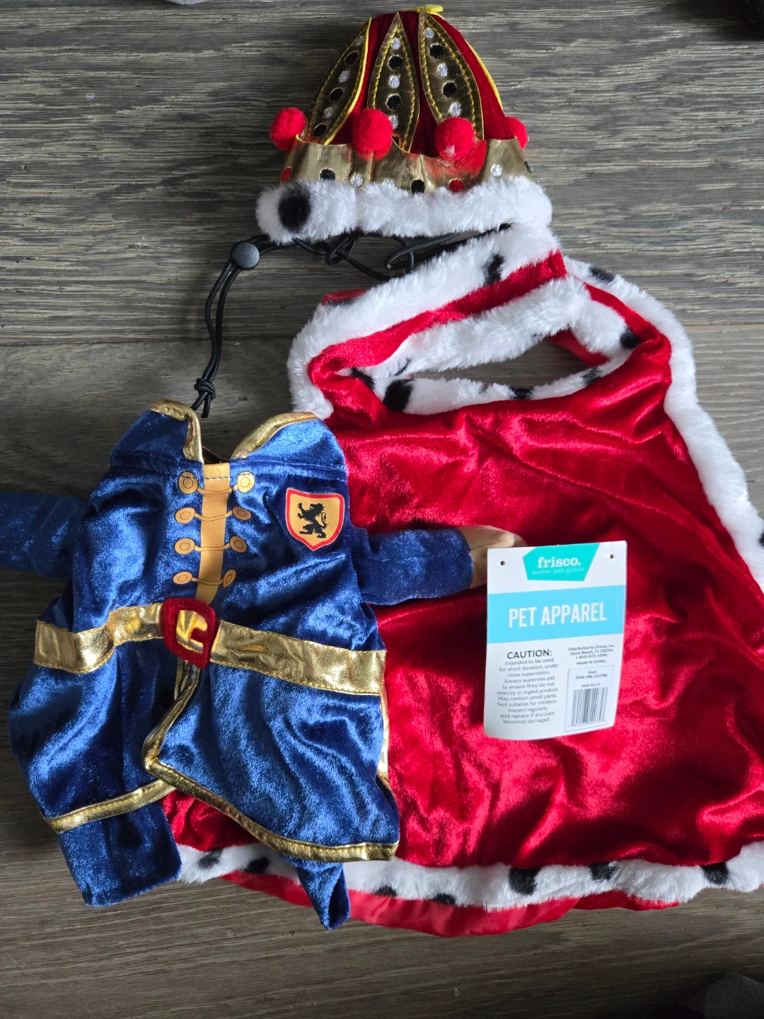 Get your furry friend ready to rule with this adorable Frisco pet apparel! This royal outfit includes a crown, cape, and a blue jacket with gold trim. Perfect for photos or just some fun dress-up time