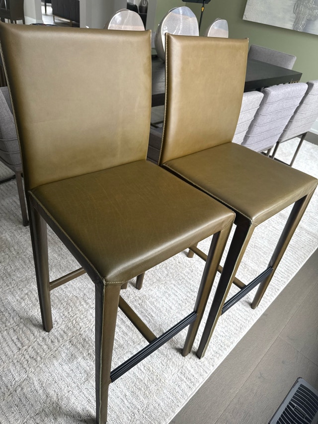 $600 for each. Pull up to the bar on our sleek, comfortable stool with reinterpreted Italian design inspiration, clean Parsons-style lines and luxe leather upholstery. Fully wrapped in top-grain leather in slate blue, the Folio bar stool is finished with neat mitered corners, flange seaming and stitched construction that have helped make it a customer favorite. High on style yet serious about comfort, the stool invites with a foam-cushioned seat and subtly curved back. A grooved footrest features a protective cover. The Folio Top-Grain Leather Bar Stool is a Crate and Barrel exclusive. By choosing FSC ®-certified furniture, you are supporting responsible management of the world's forests. FSC ®-certified plywood and steel frame Top-grain, semi-aniline leather Mitered corners, flanged edges and stitched leather construction Grooved footrest with protective cover Learn more about natural leather characteristics Features FSC ®-certified wood from forests that are responsibly managed to be environmentally sound and socially beneficial Imported