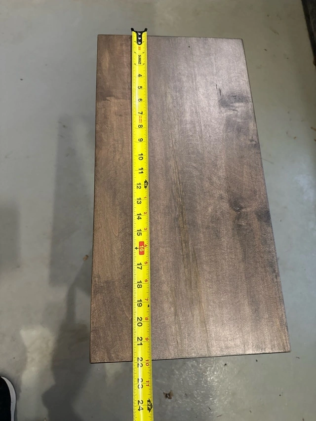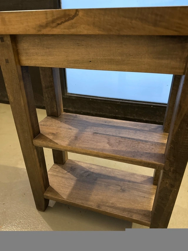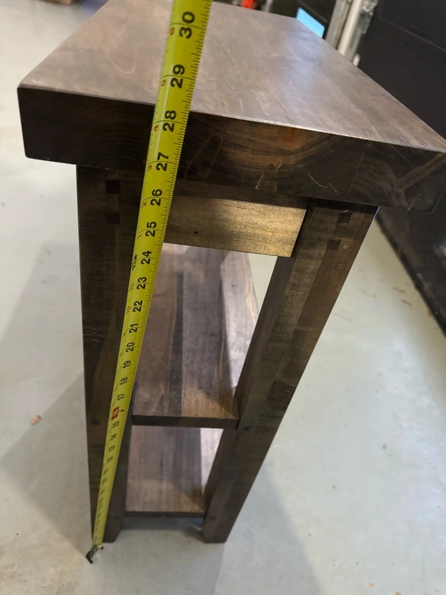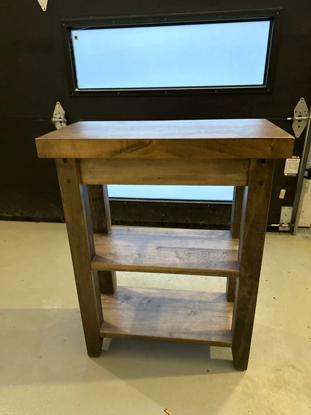 I'm selling a solid wood side table with a rustic charm, perfect for adding a touch of warmth to any room. It has dimensions of 30" height x 22" length x 14" width. This used table is sturdy and features two shelves for extra storage or display.