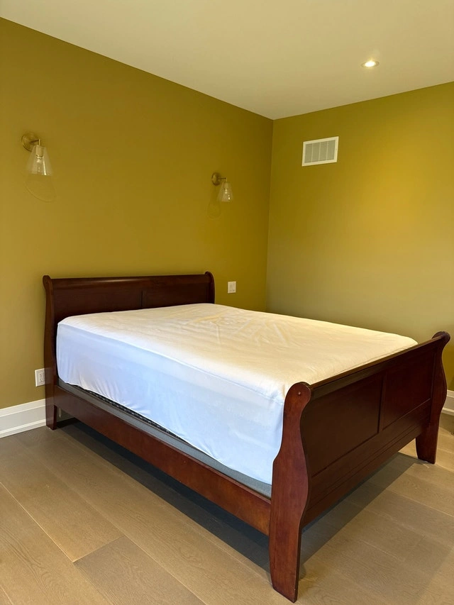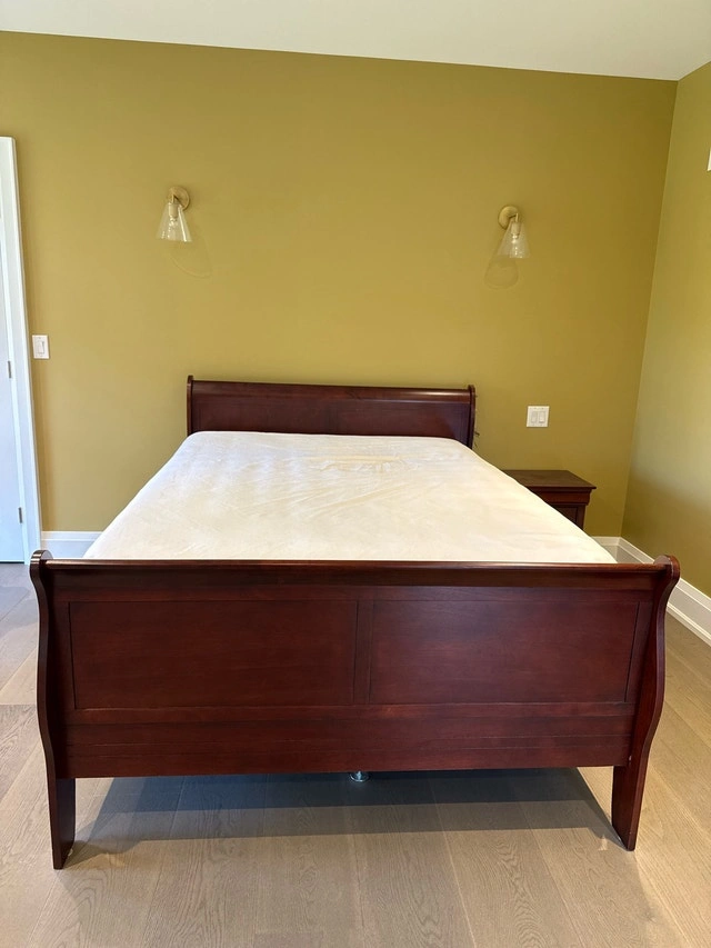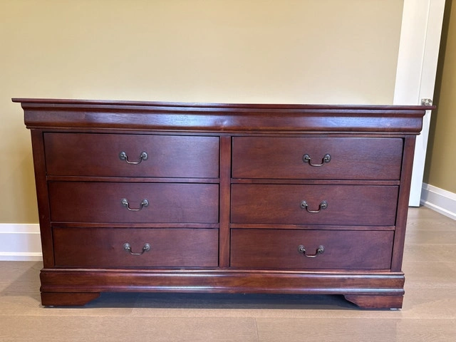This is a used but well-maintained queen-sized bedroom set, perfect for adding a touch of elegance to your bedroom. The set includes a queen bed frame, two-drawer nightstand, and a six-drawer dresser. All pieces are made of sturdy wood with a rich finish. The set is in good condition, ready to enhance your sleeping space. Mattress and box are not included.