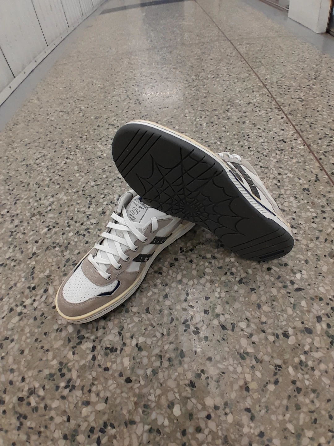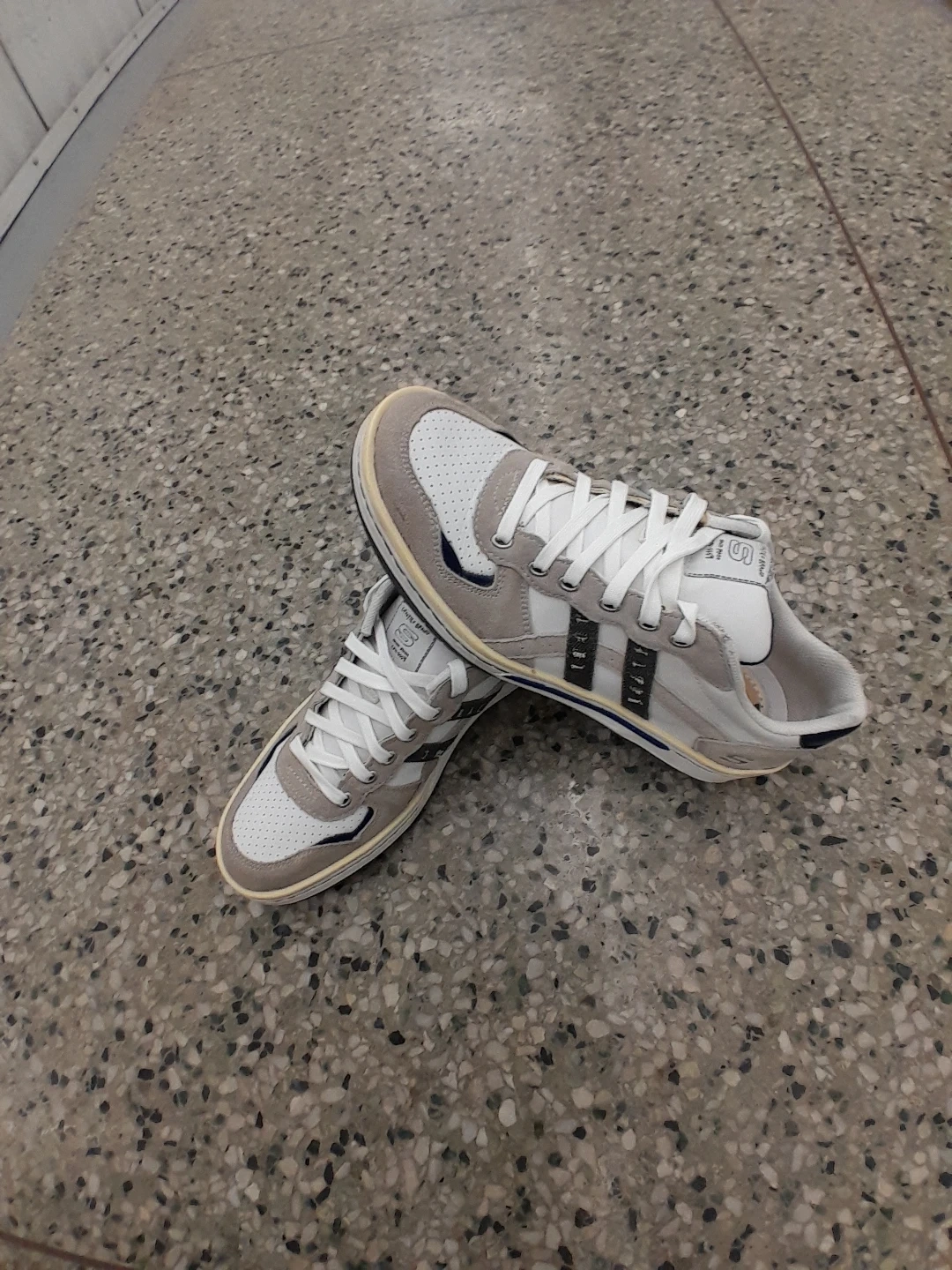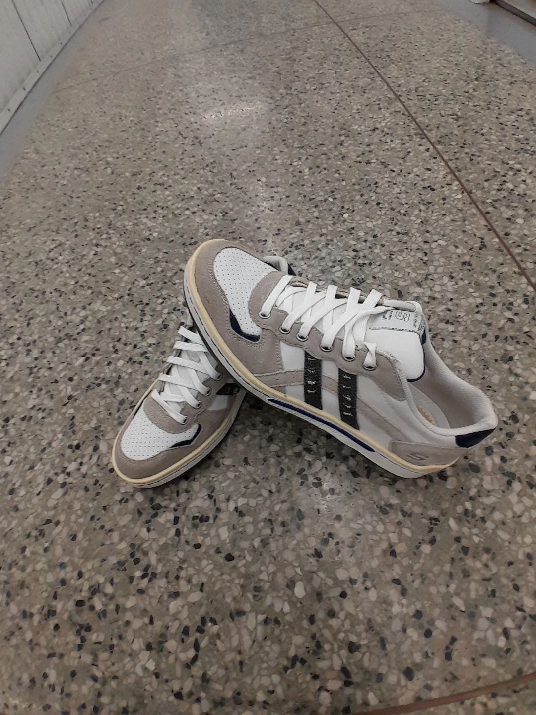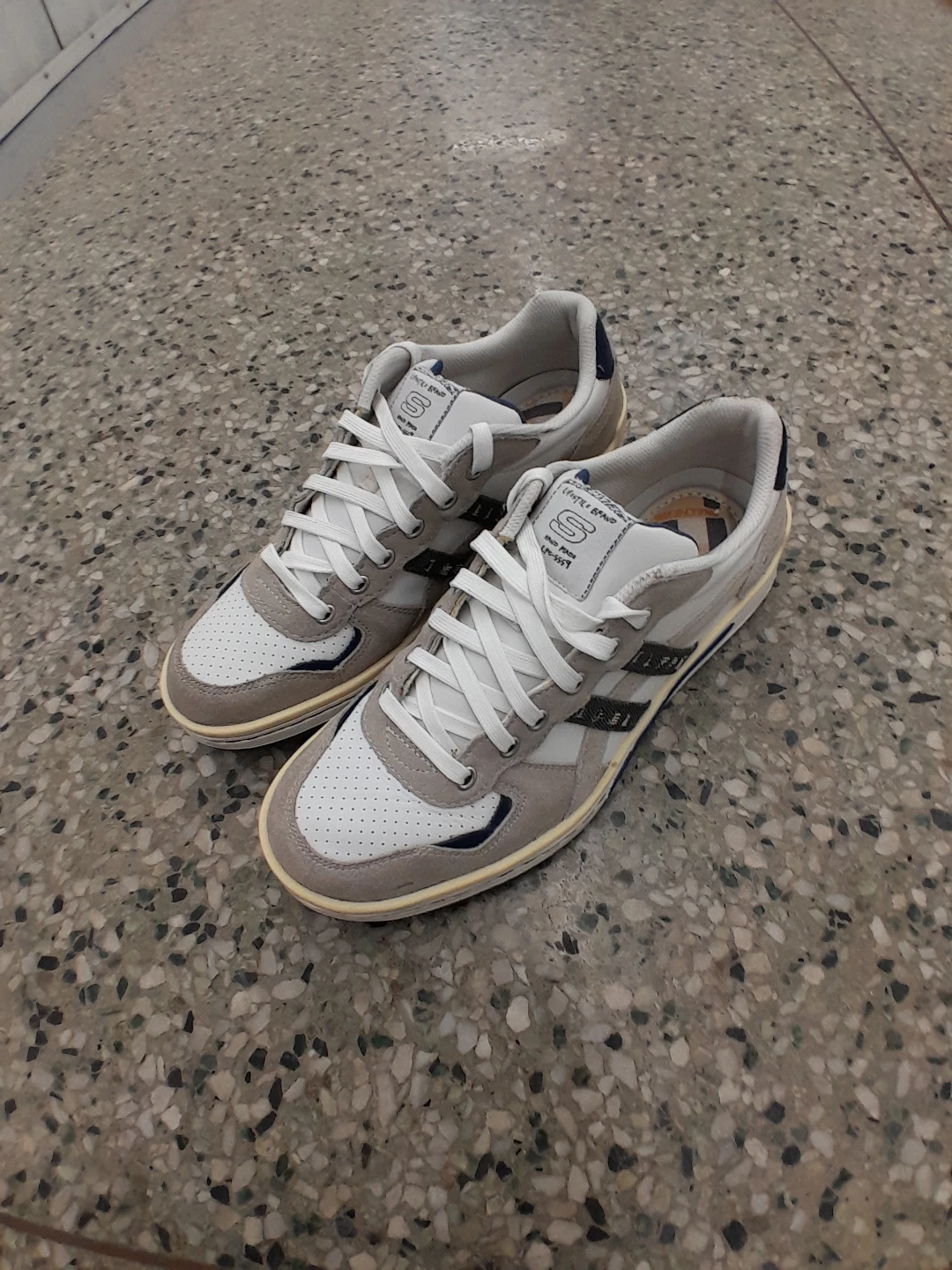 Skechers streetwear sneakers. They feature a white and grey colour scheme with a classic lace-up design. The soles are in good condition, ready for everyday wear! Men's size 9