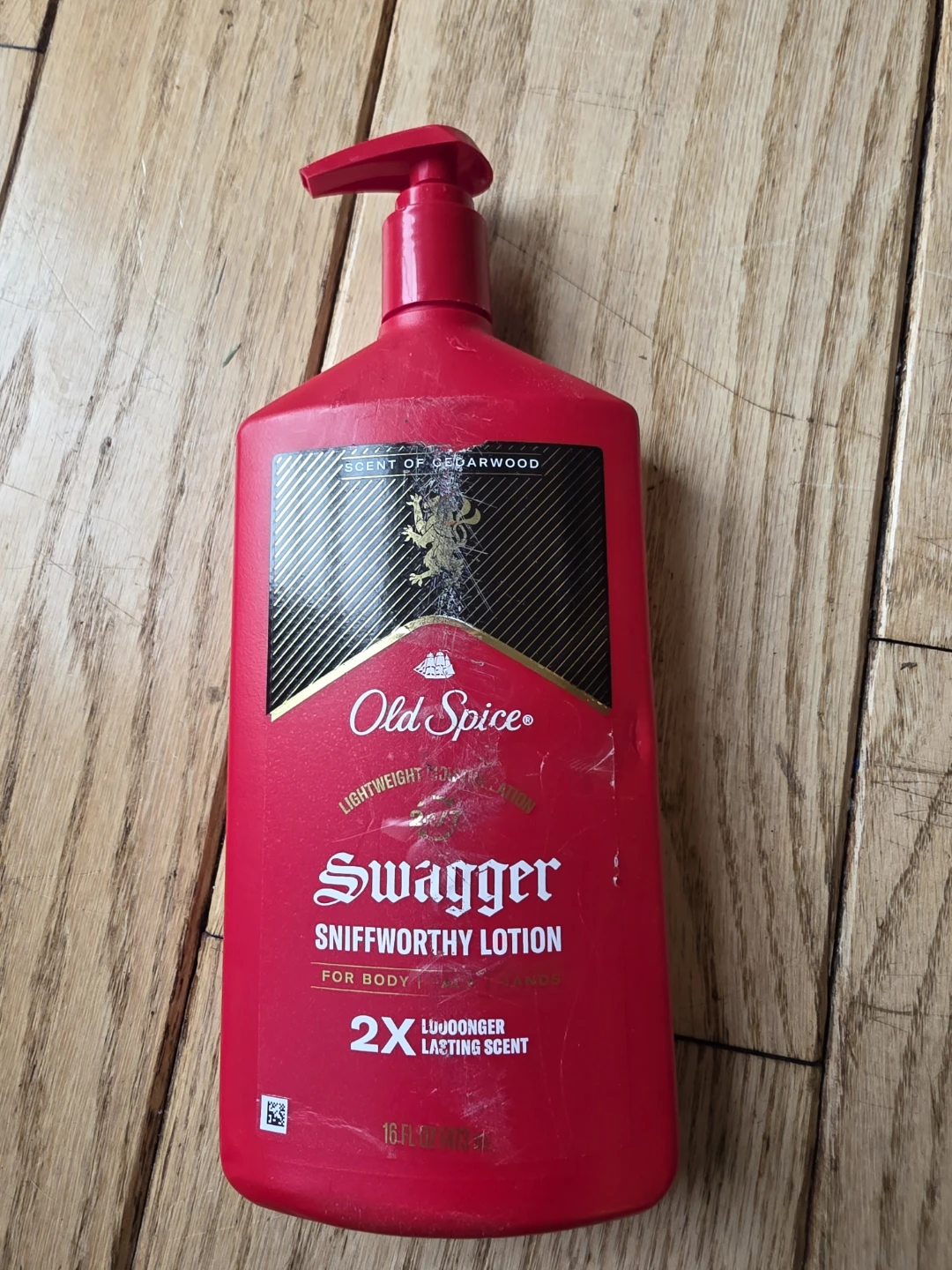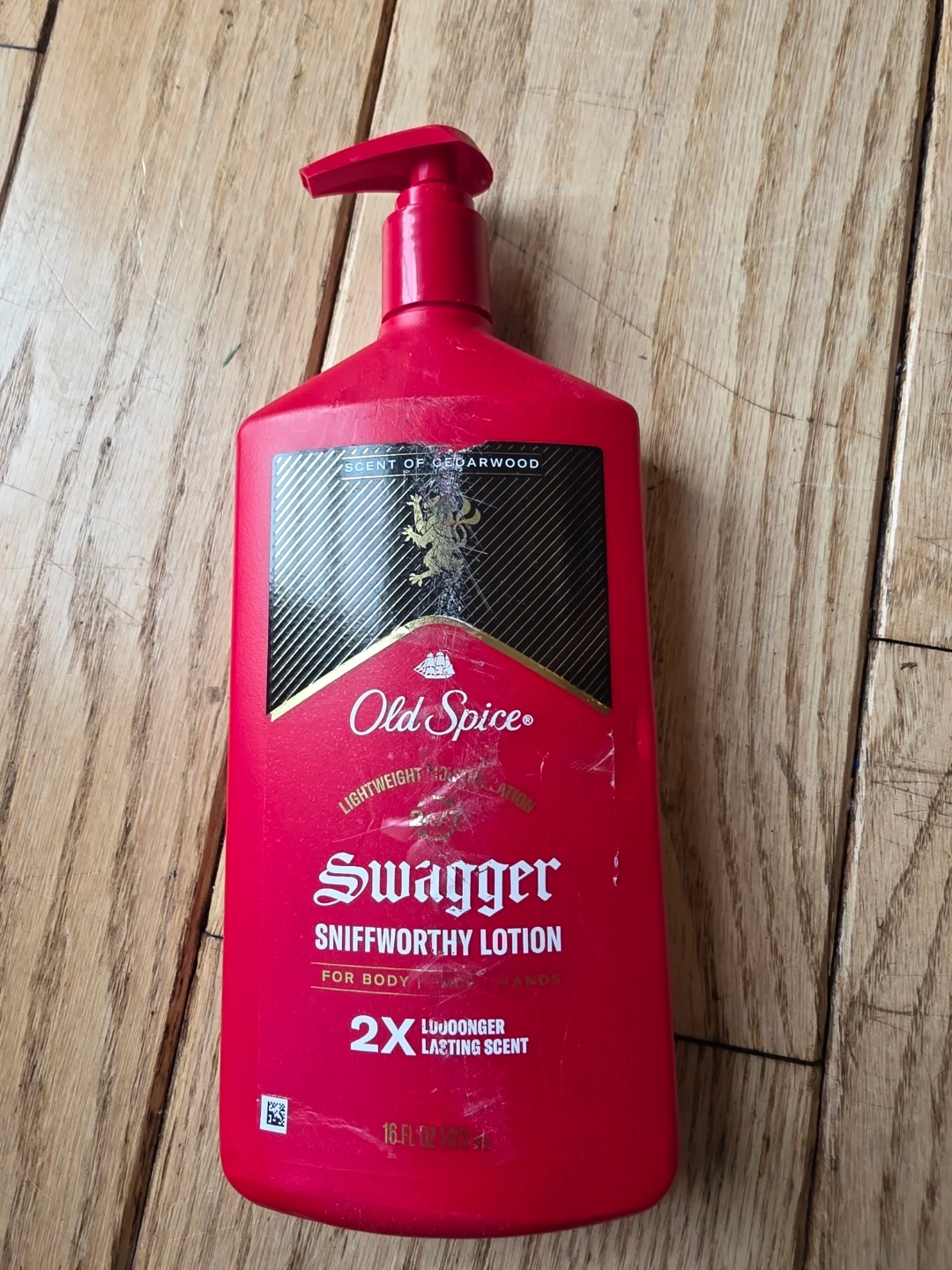 Selling a bottle of Old Spice Swagger Sniffworthy Lotion for body and hands. It's a lightweight lotion with a scent of cedarwood. This bottle contains 16 fl oz and promises 2x longer lasting scent!