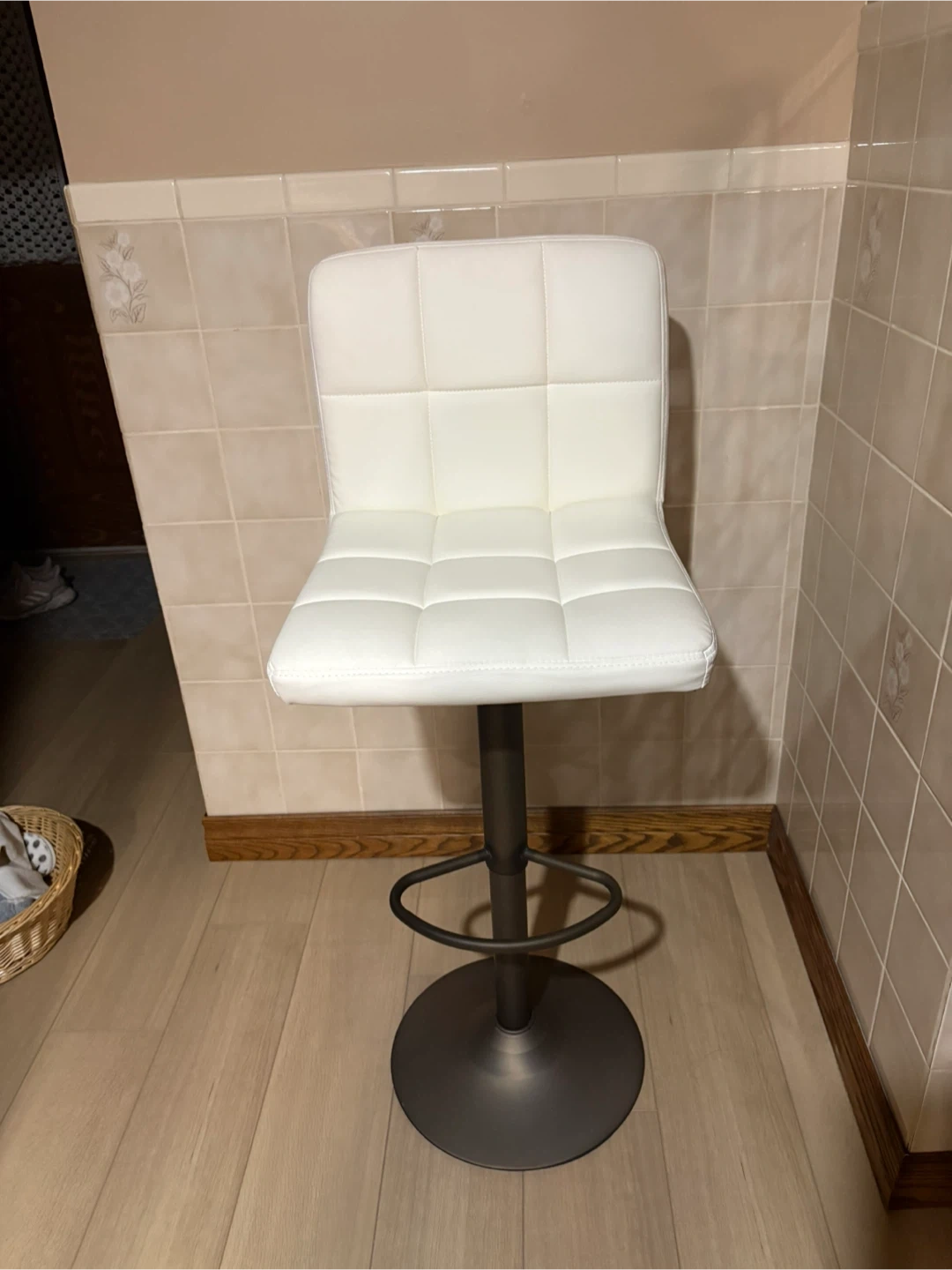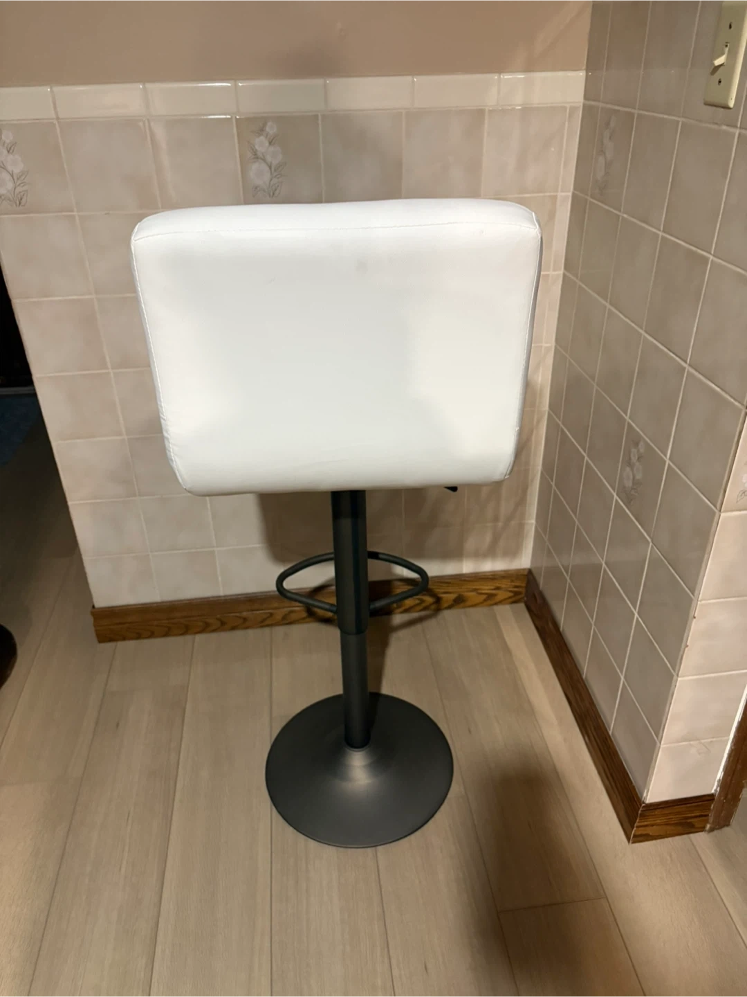 Comfy white bar stool with an adjustable height! It's in great shape and would look great in any kitchen or bar area.