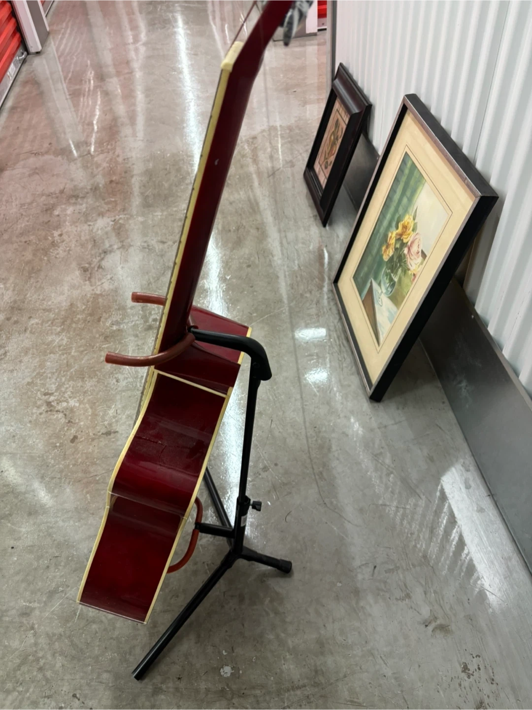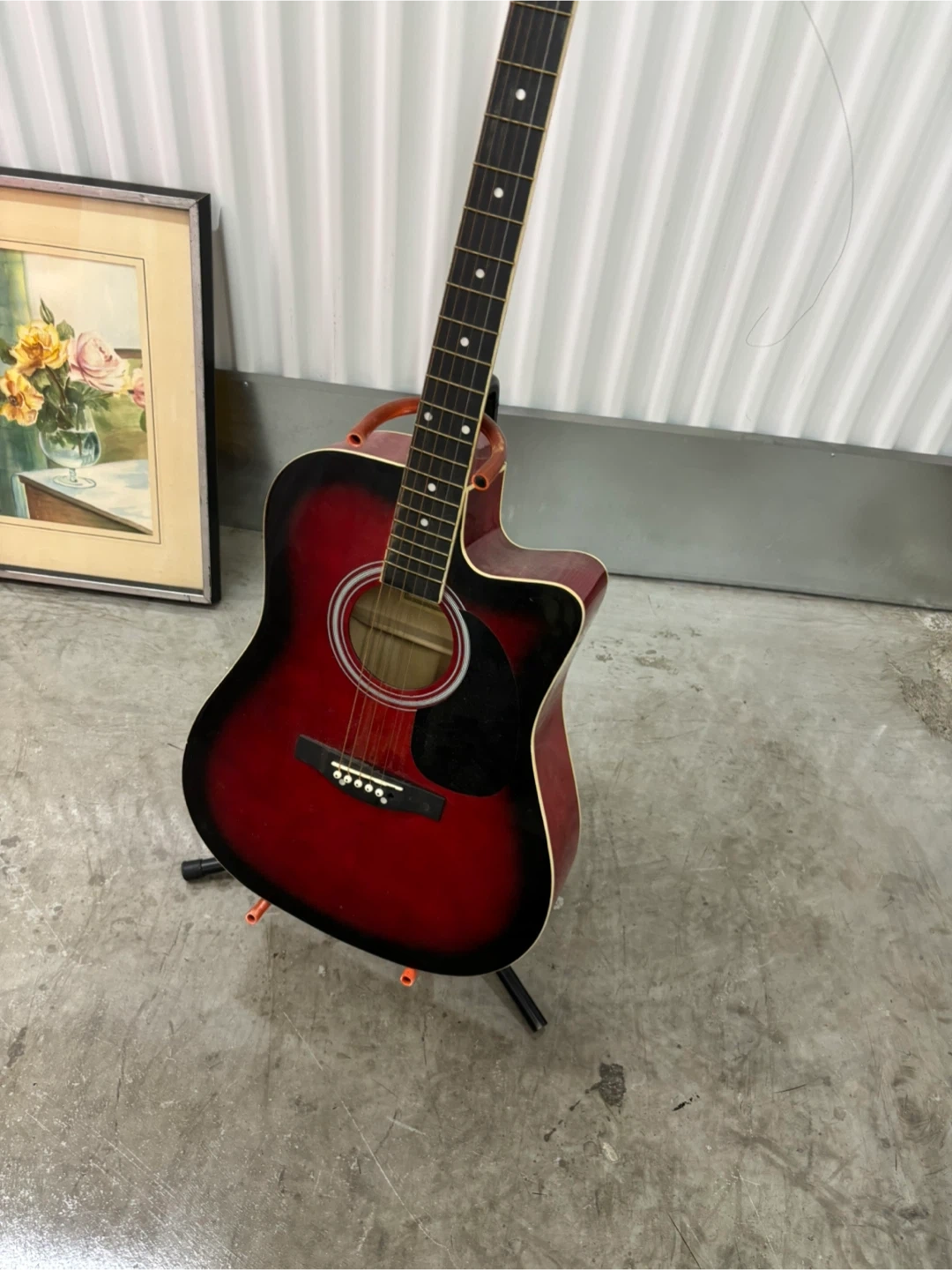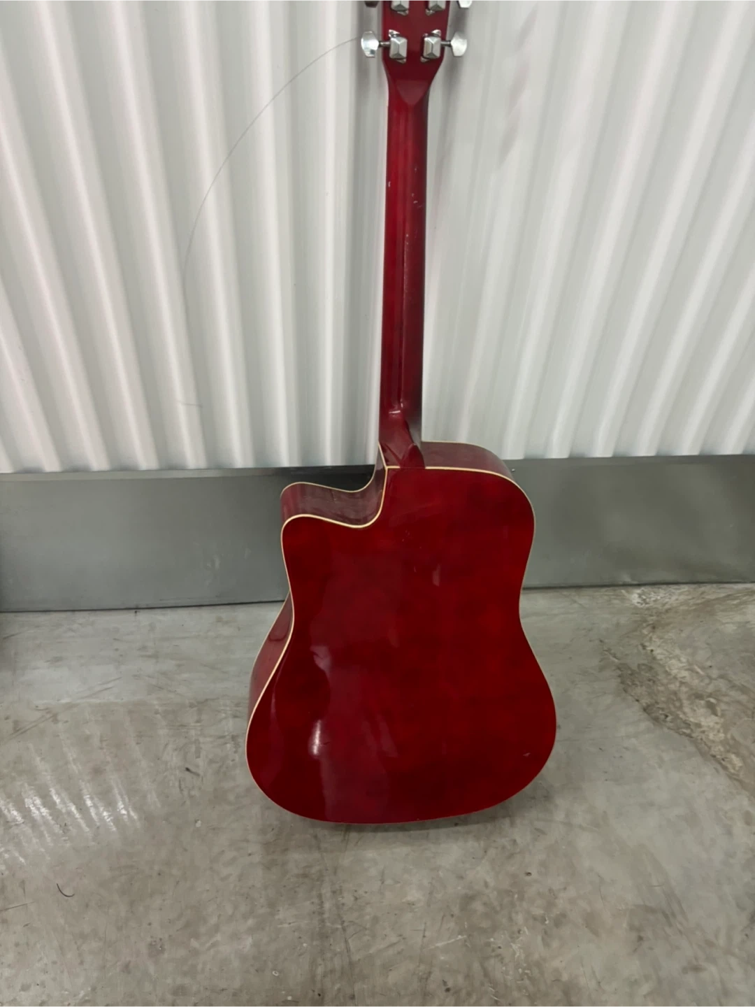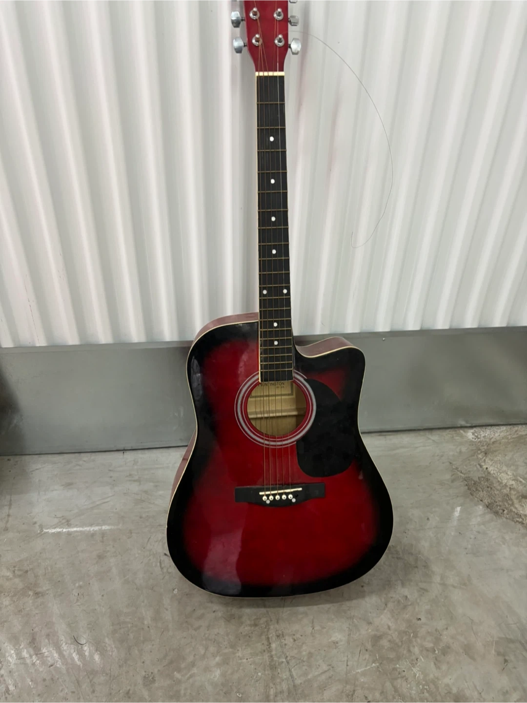 Acoustic guitar in a striking red and black finish! It's in good condition and ready to play. Perfect for beginners or experienced musicians alike