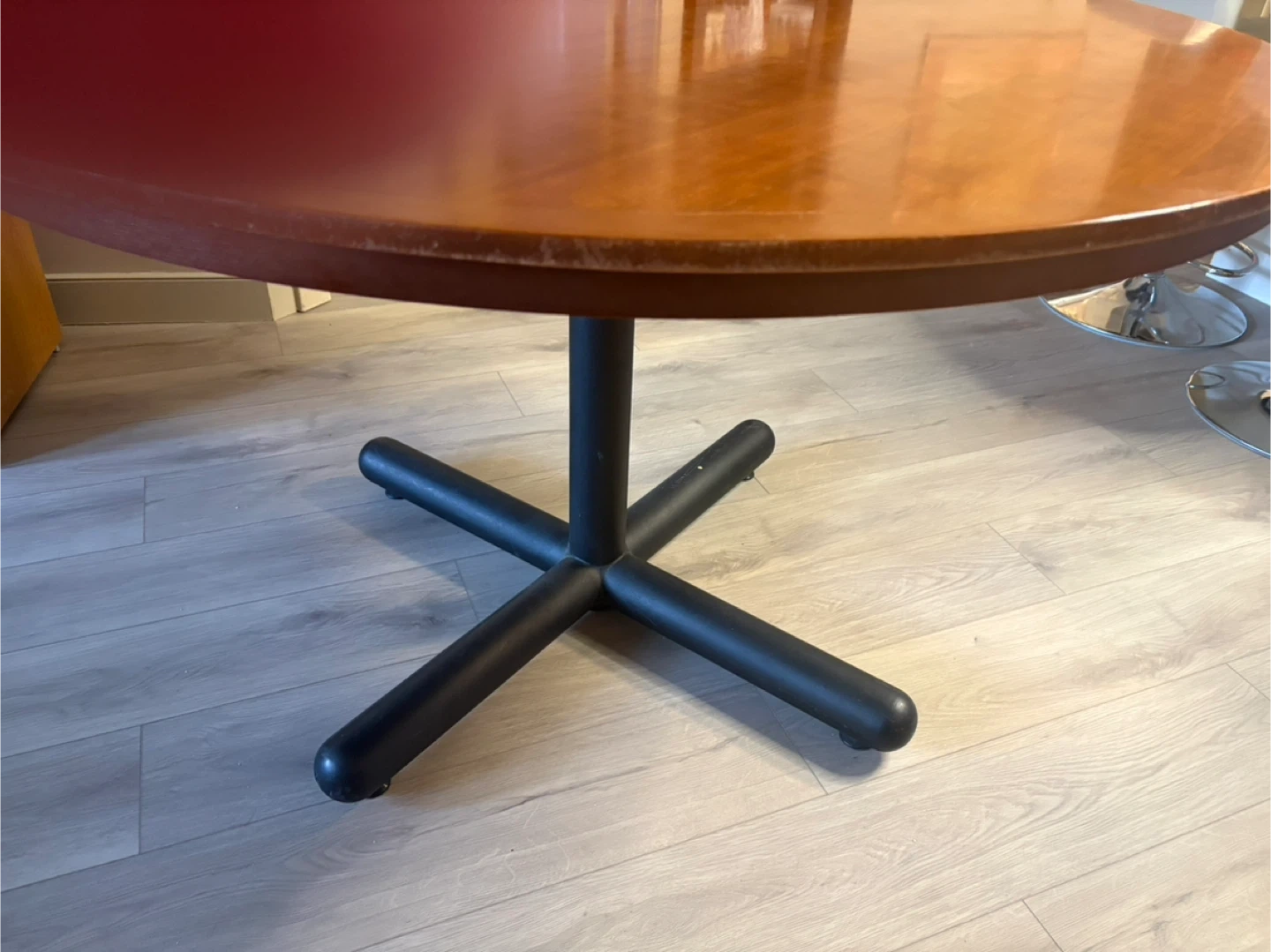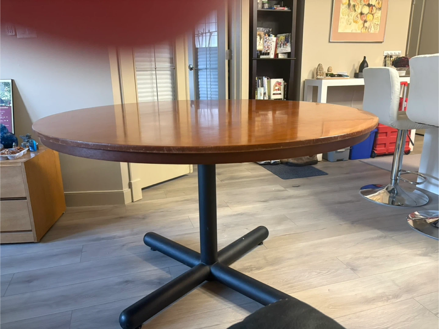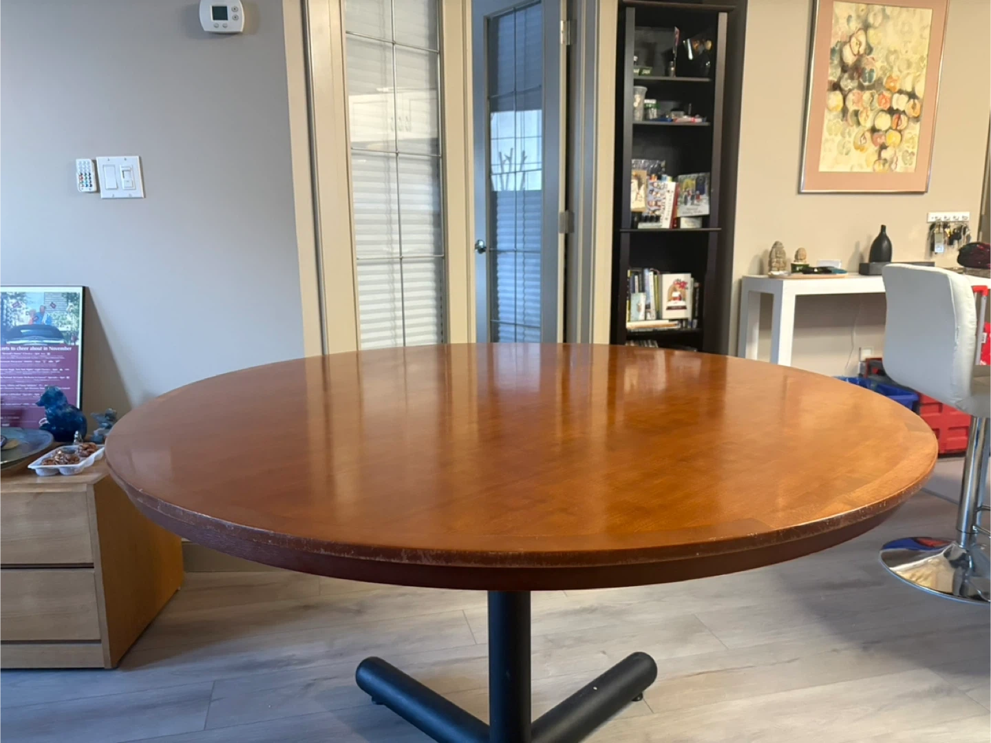 Selling a round wooden dining table. It's in good used condition.