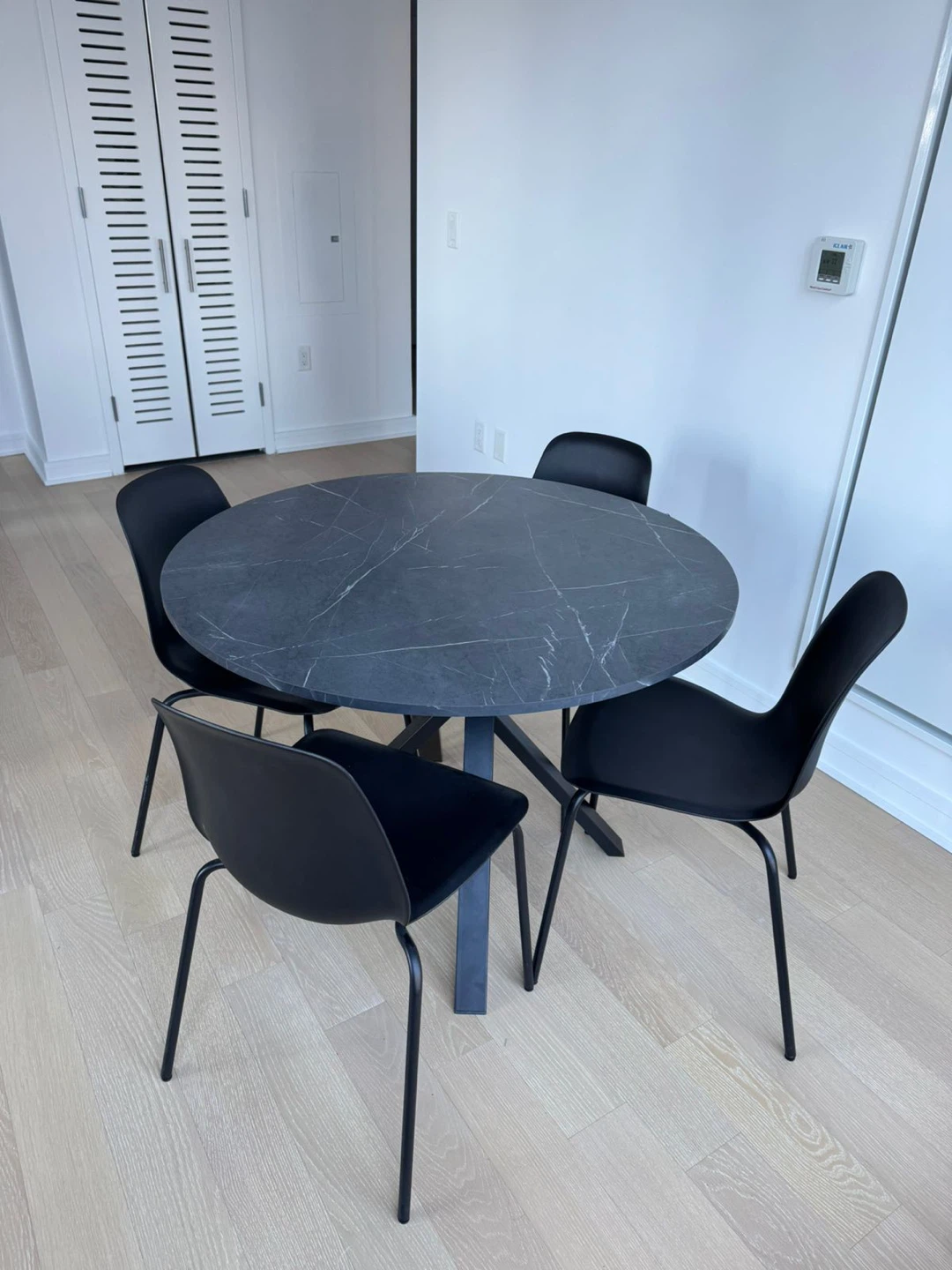 Selling an IKEA round black dining table with four matching chairs! The table has a modern design with a marble effect top. The chairs are simple and comfortable, perfect for a dining area or kitchen. They are in perfect condition and ready for a new home!