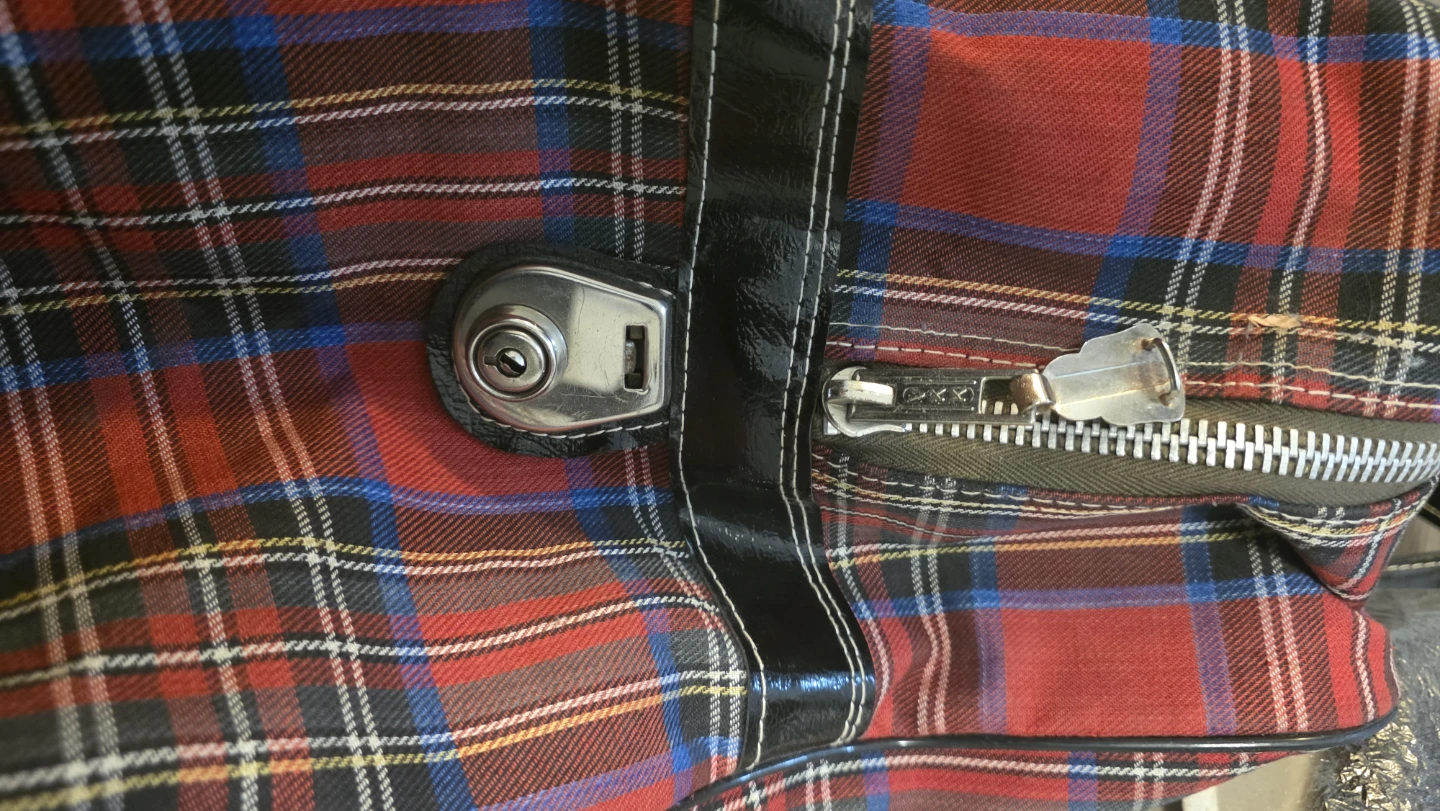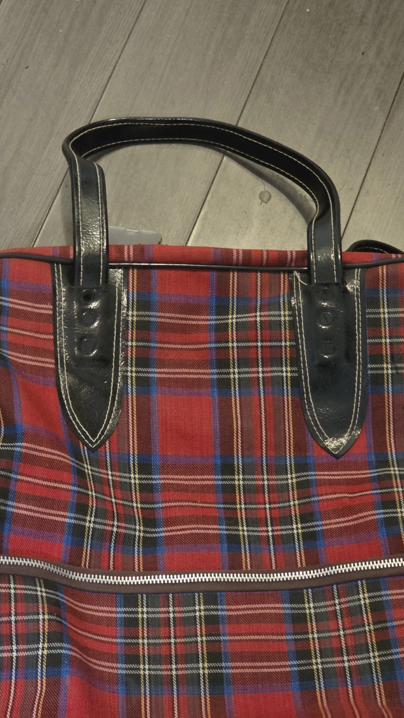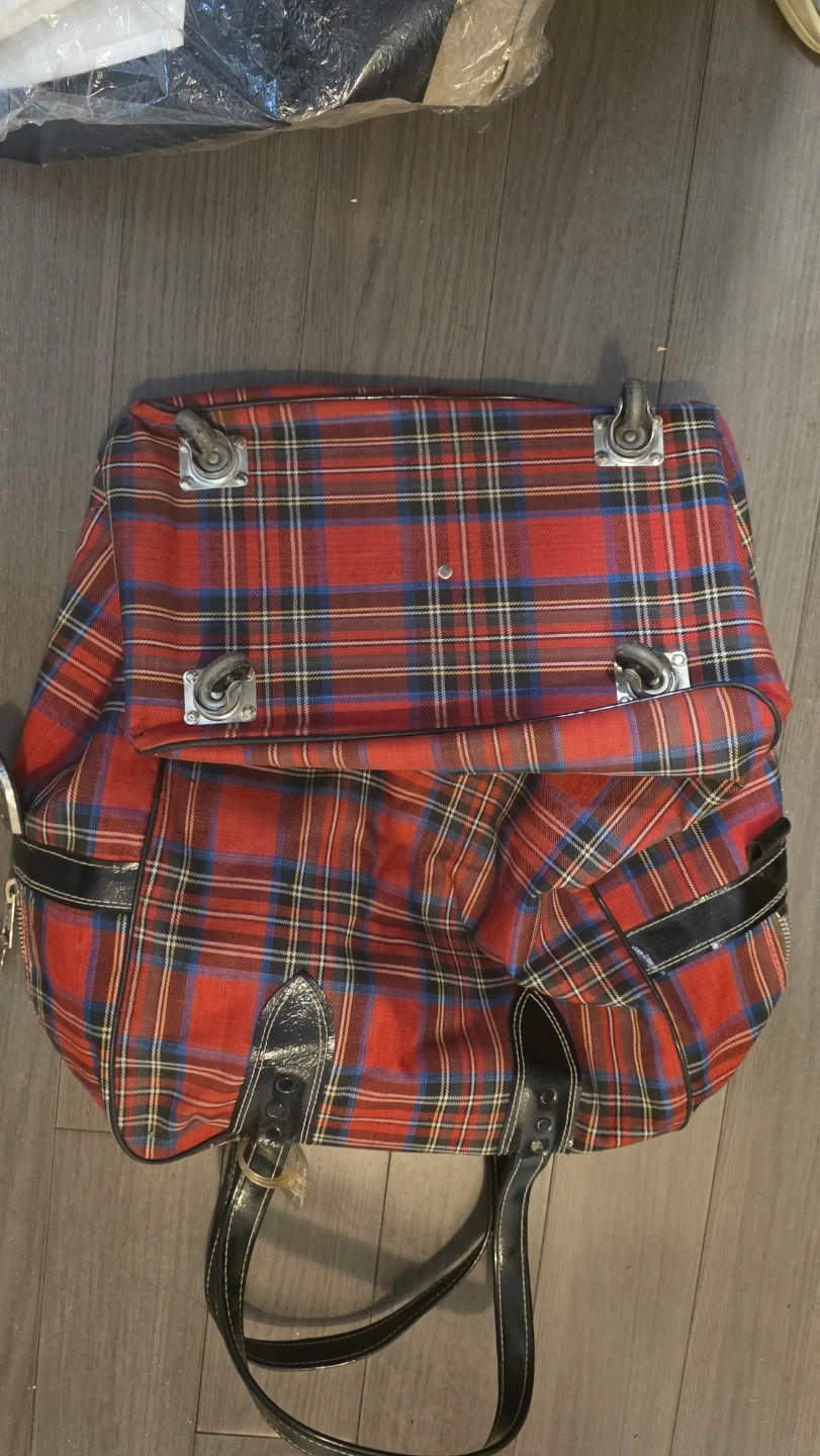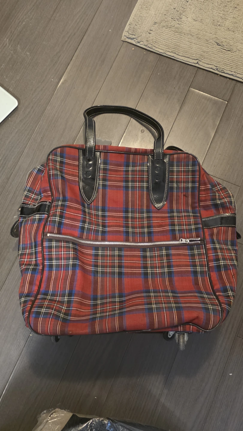 Selling a red plaid suitcase with black handles and wheels. It's in good condition and ready for your next trip!