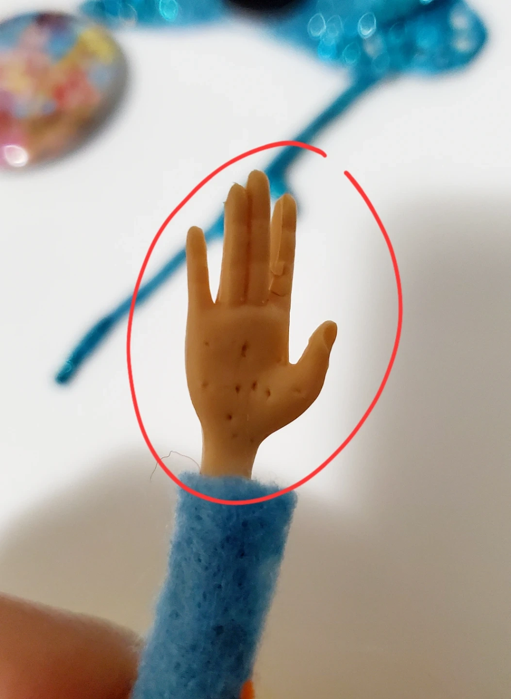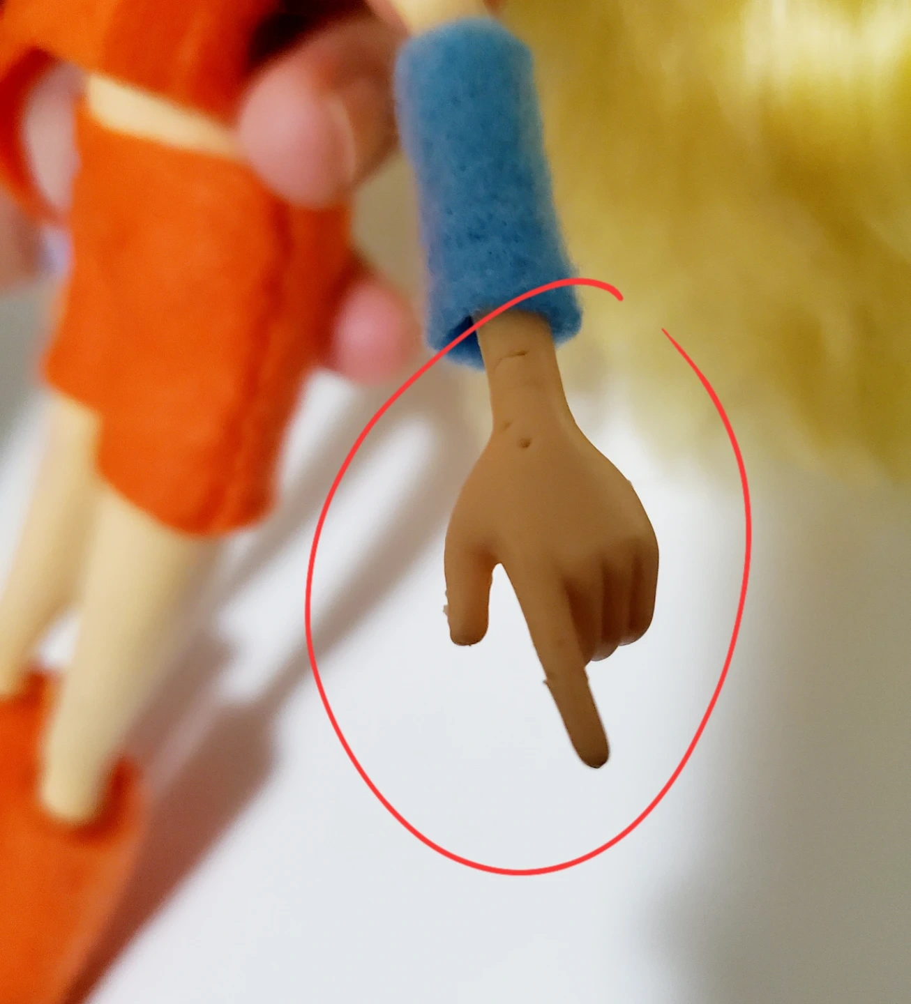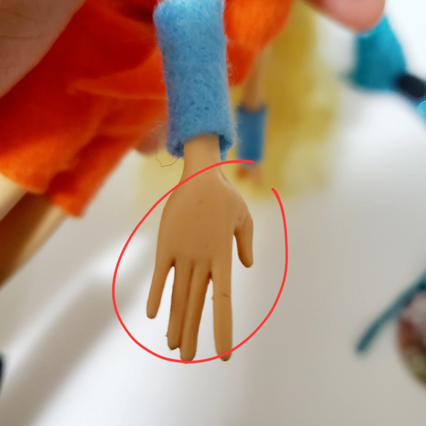 Stella: She's wearing a handmade outfit- top, shorts, boots, hairpieces and wrist pieces made from felt. The headband is 3D printed and painted. Wings are made of felt and has glitter with a magnet. The staff is made from hot glue. See photos for flaws.