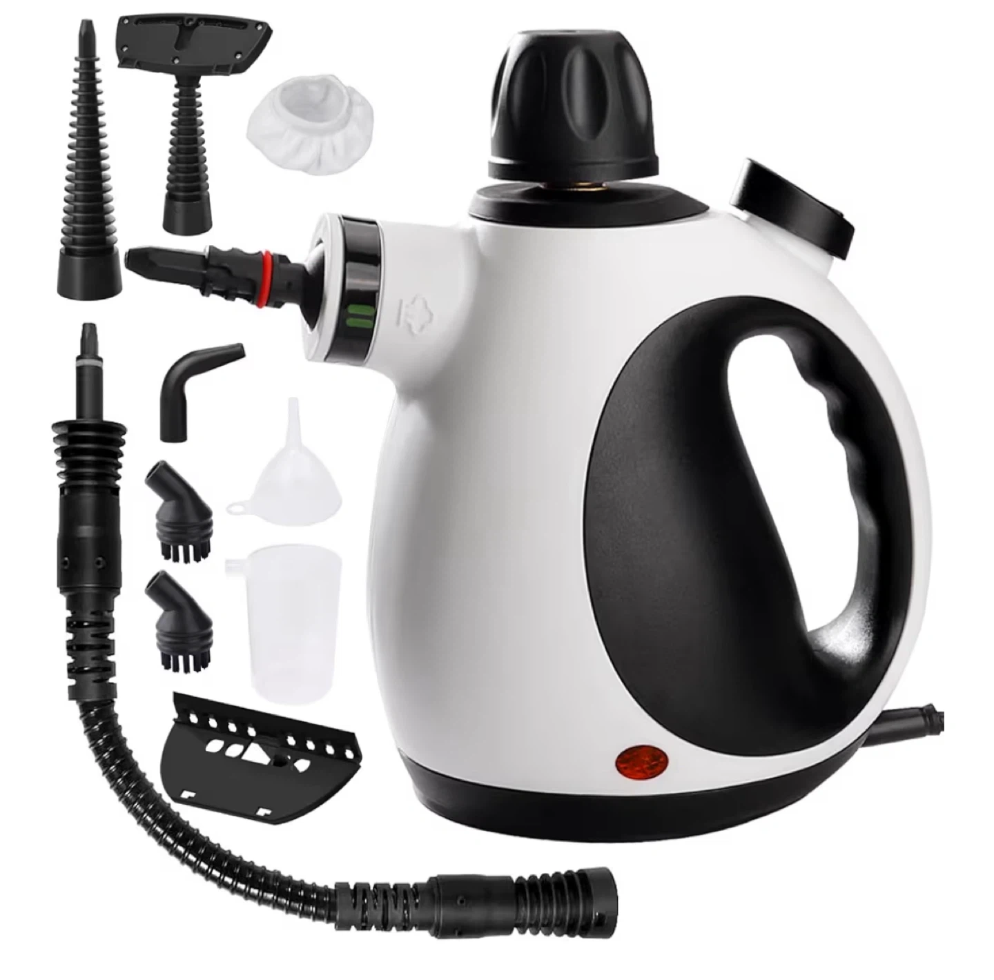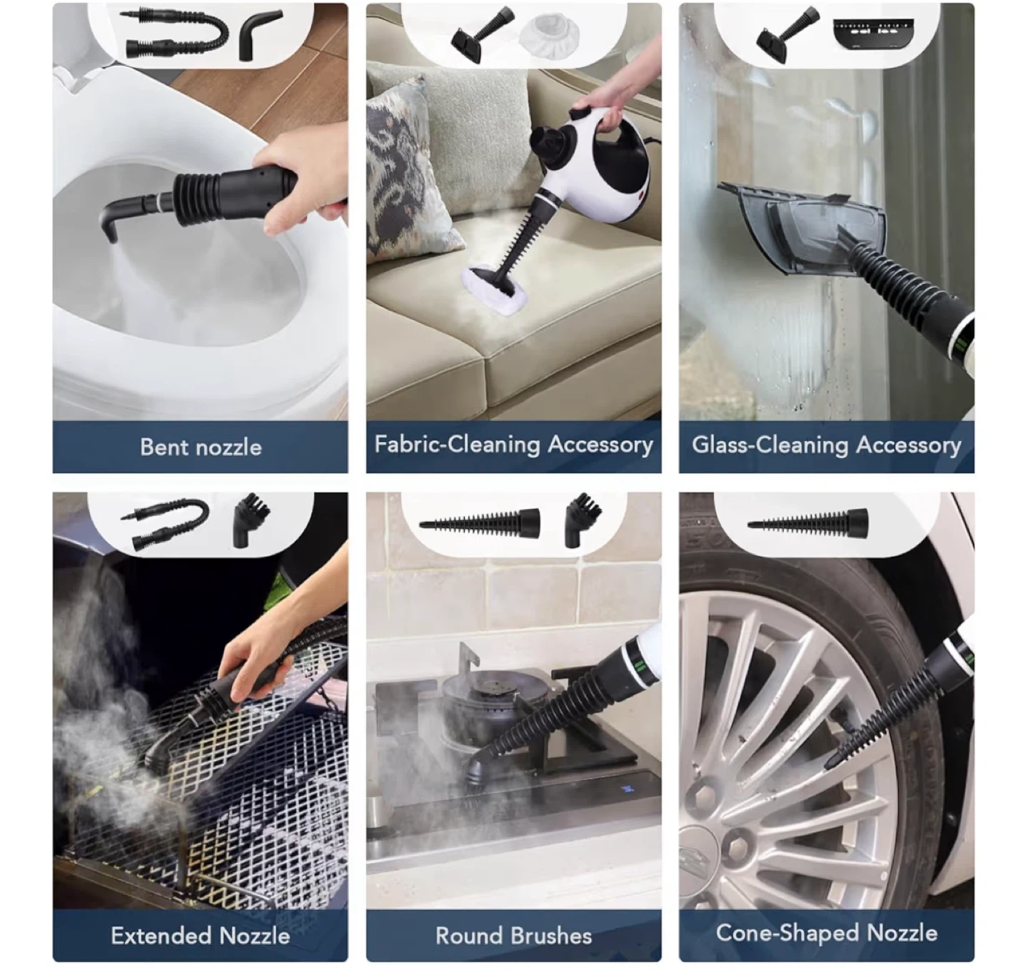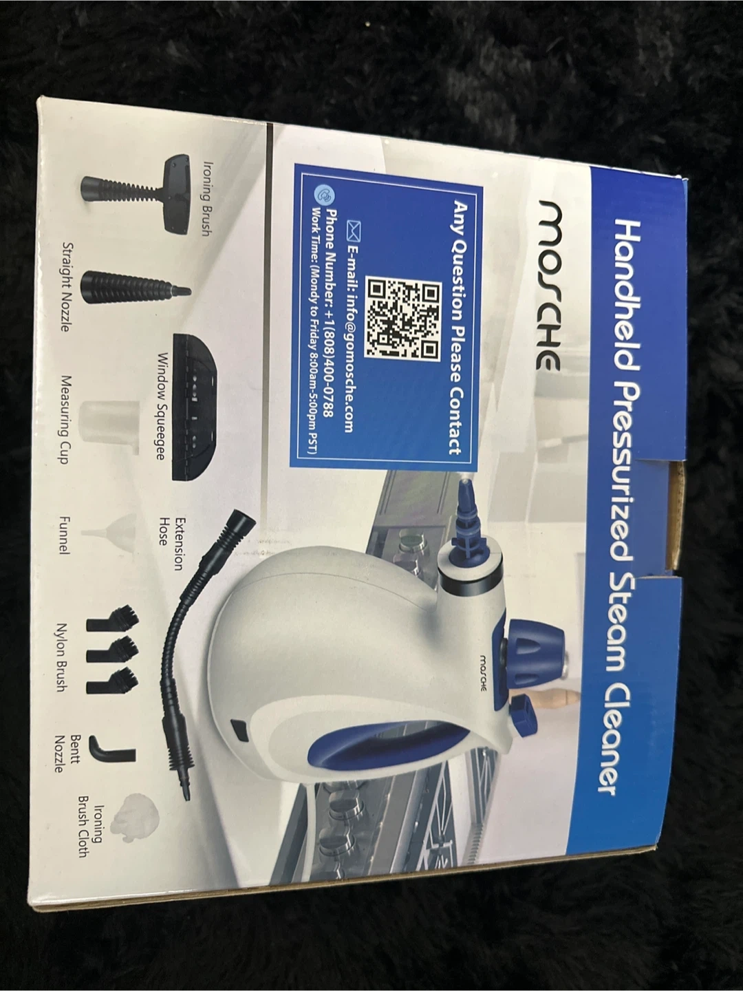 I'm selling a mosche handheld pressurized steam cleaner. It includes various attachments for different cleaning tasks, such as a bent nozzle, fabric-cleaning accessory, glass-cleaning accessory, extended nozzle, round brushes, and a cone-shaped nozzle! It also comes with the box