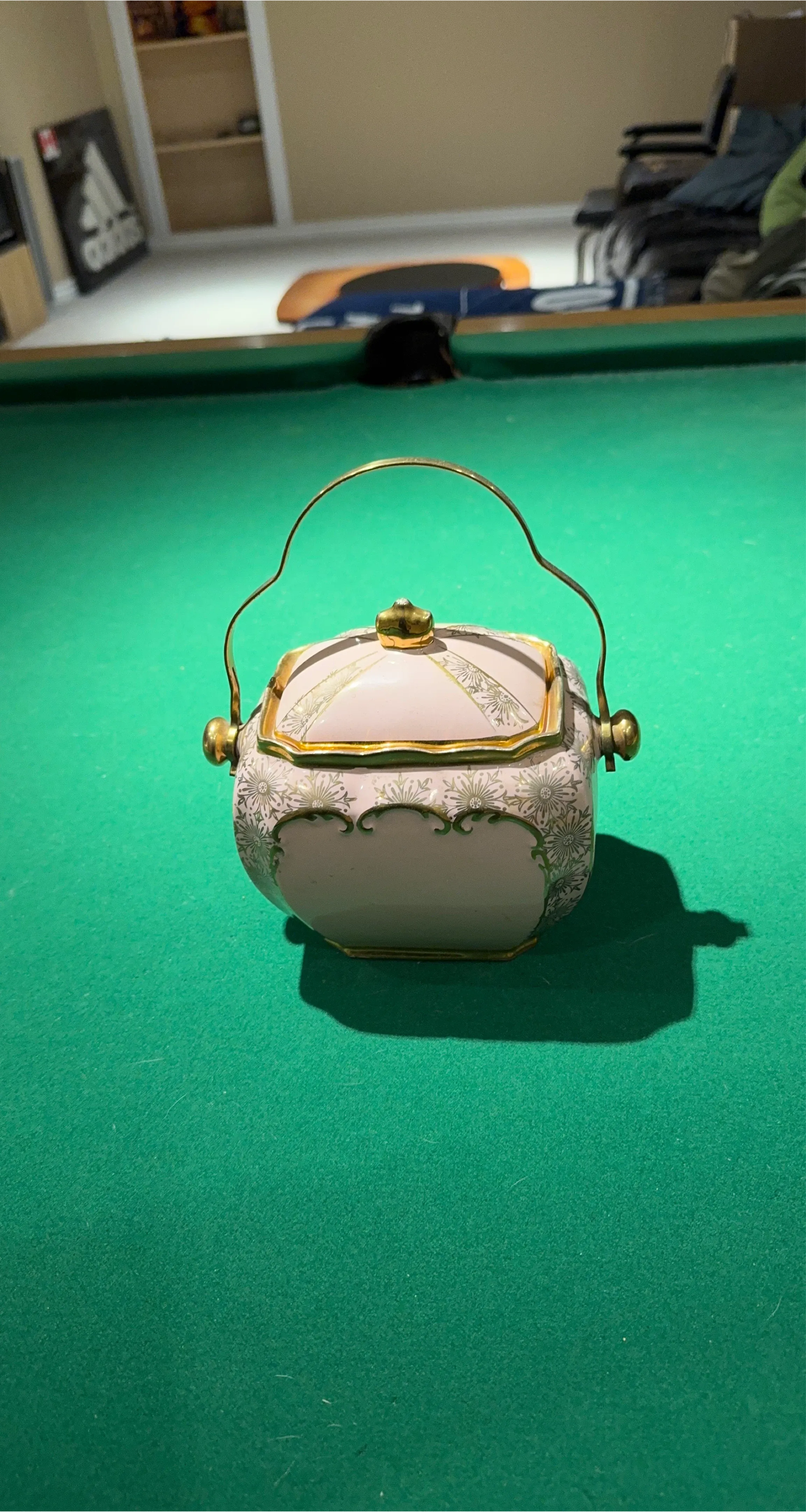 Selling a cute vintage pink ceramic trinket box with gold accents and a handle. It's perfect for storing small items or as a decorative piece!