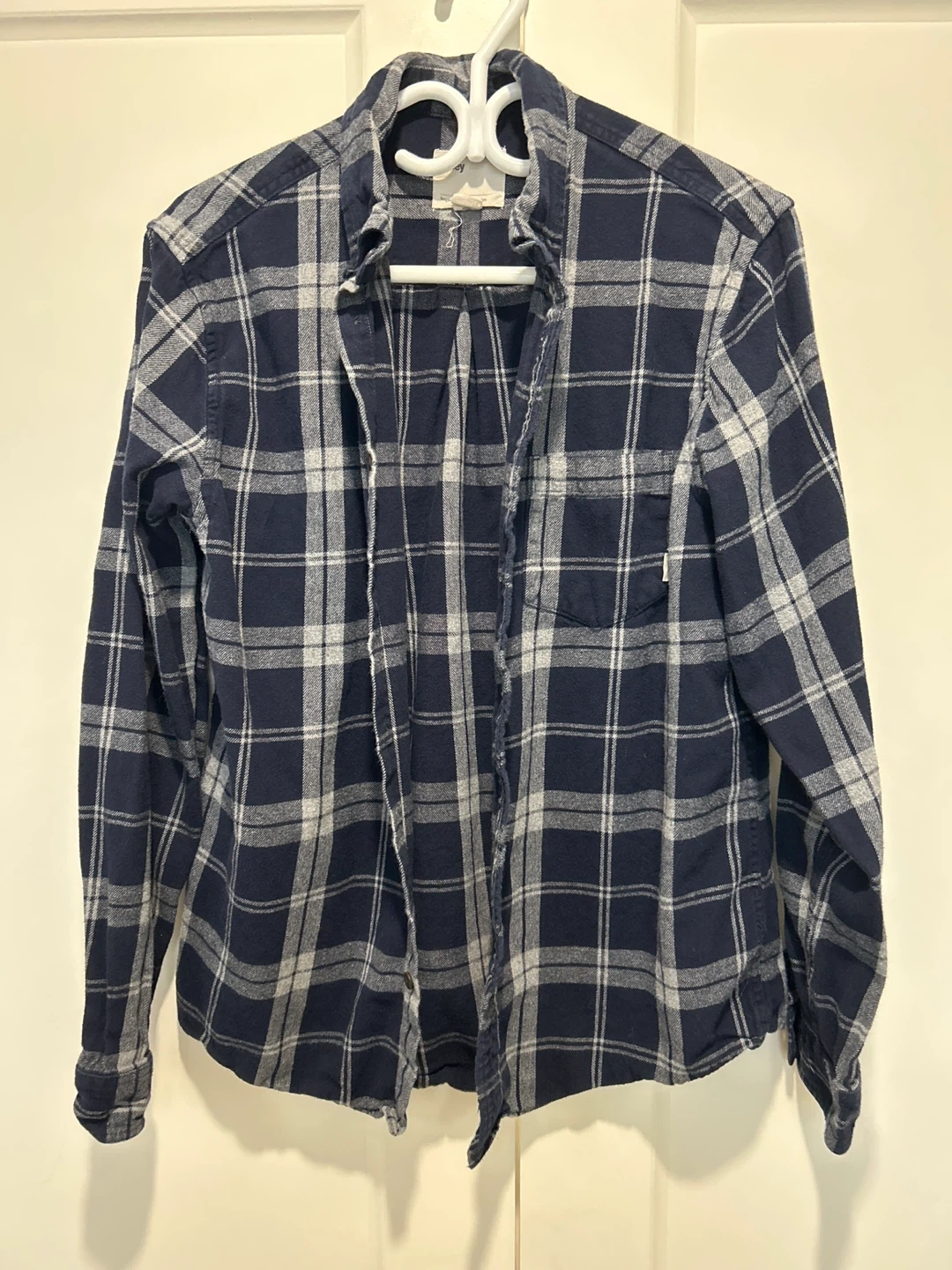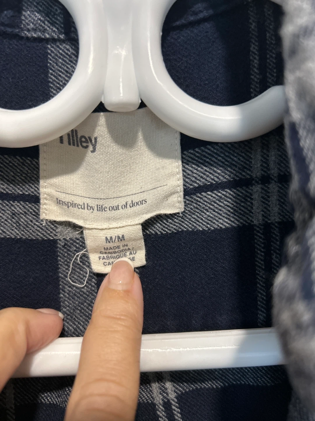Cozy Tilley flannel shirt in a classic navy and white plaid pattern. It's a size medium and made in Cambodia! Perfect for layering or wearing on its own.
