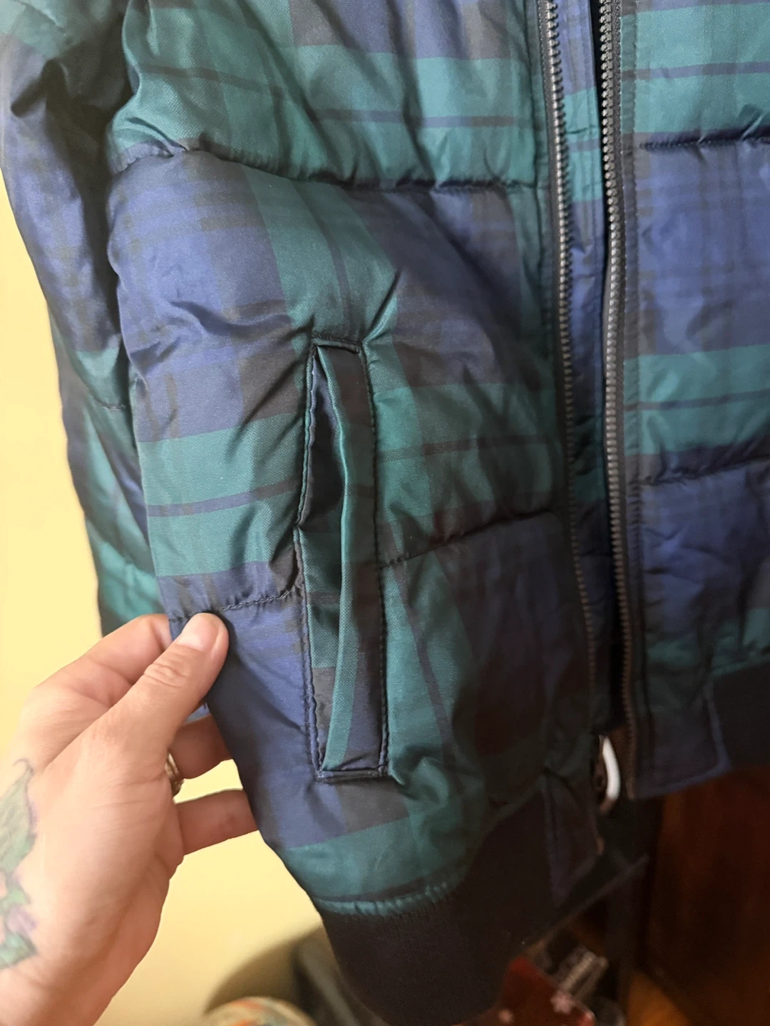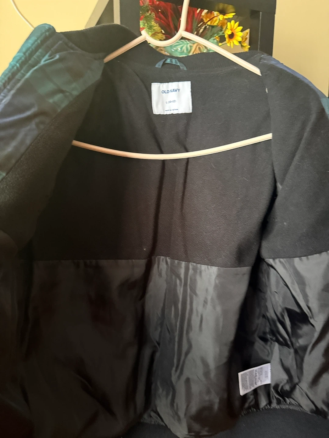 Selling an Old Navy puffer jacket with a plaid pattern in shades of green and blue. The size is L (10-12). It's in great condition and ready for a new owner!