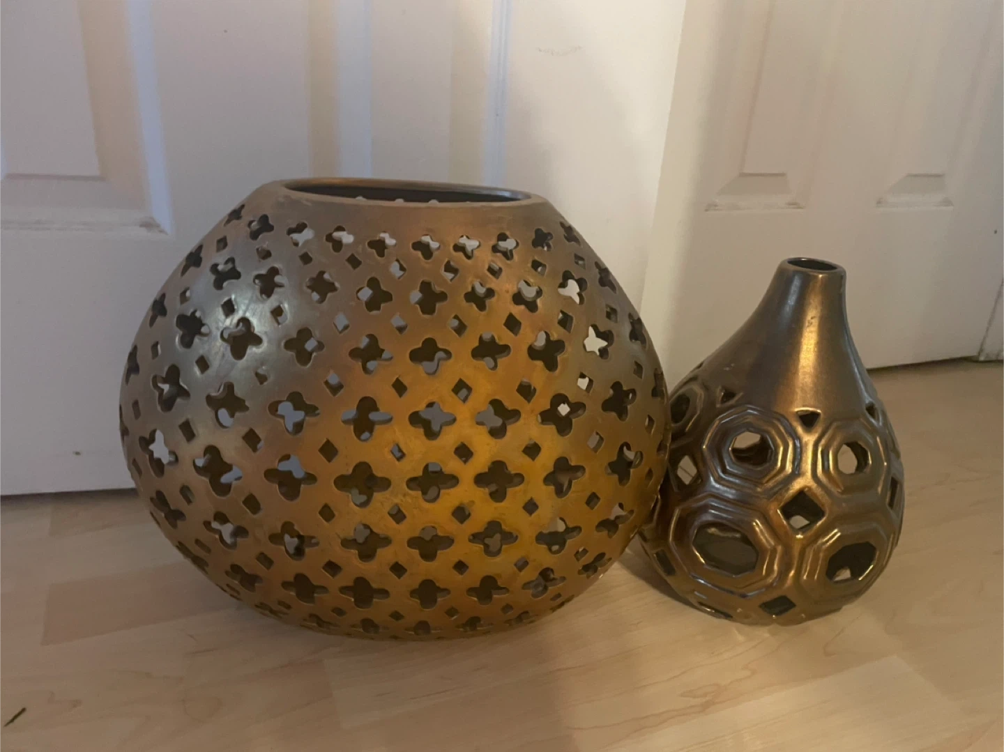 Selling a set of two decorative vases in a bronze colour. They have a unique cut-out design that would look great in any room. They're in good condition and ready to add a touch of style to your home!
