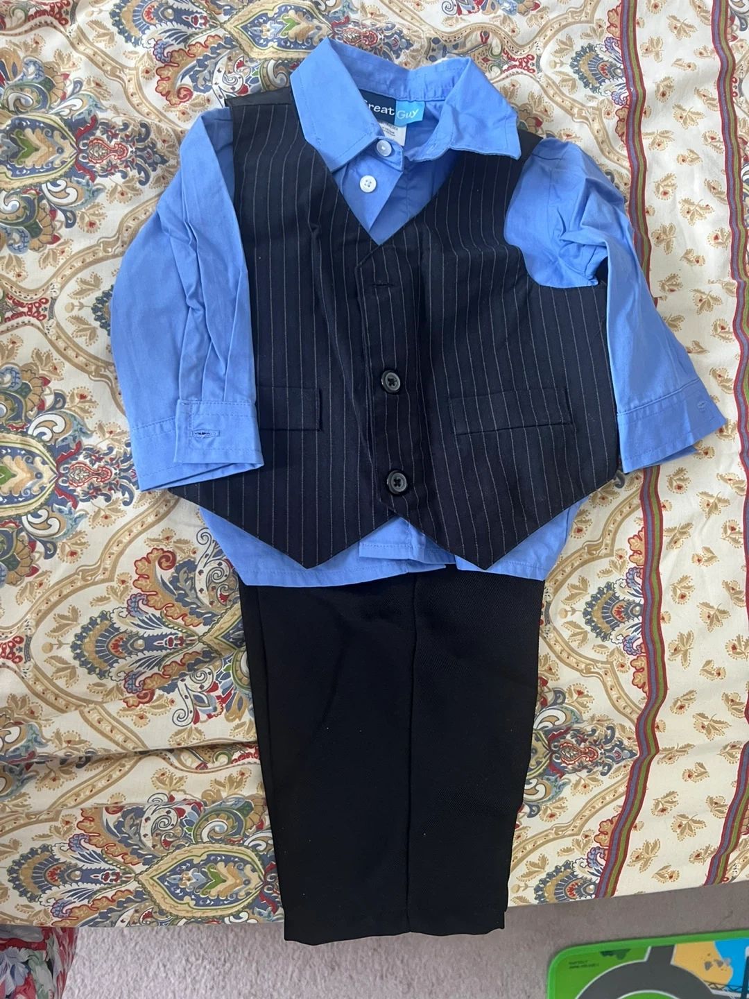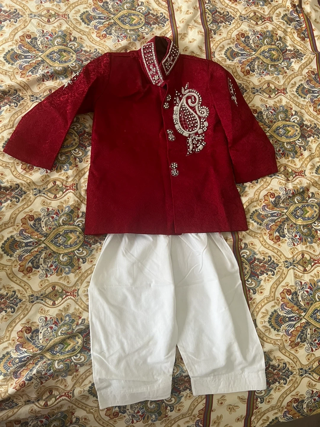 Selling a bundle of baby and toddler clothing. Includes a vest and pants set with tie, a sleep sack, a red kurta pajama set, a pair of overalls, and a black suit set. All in great condition!