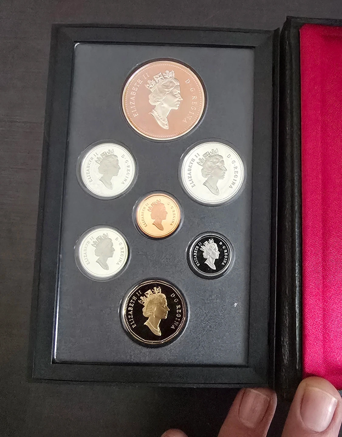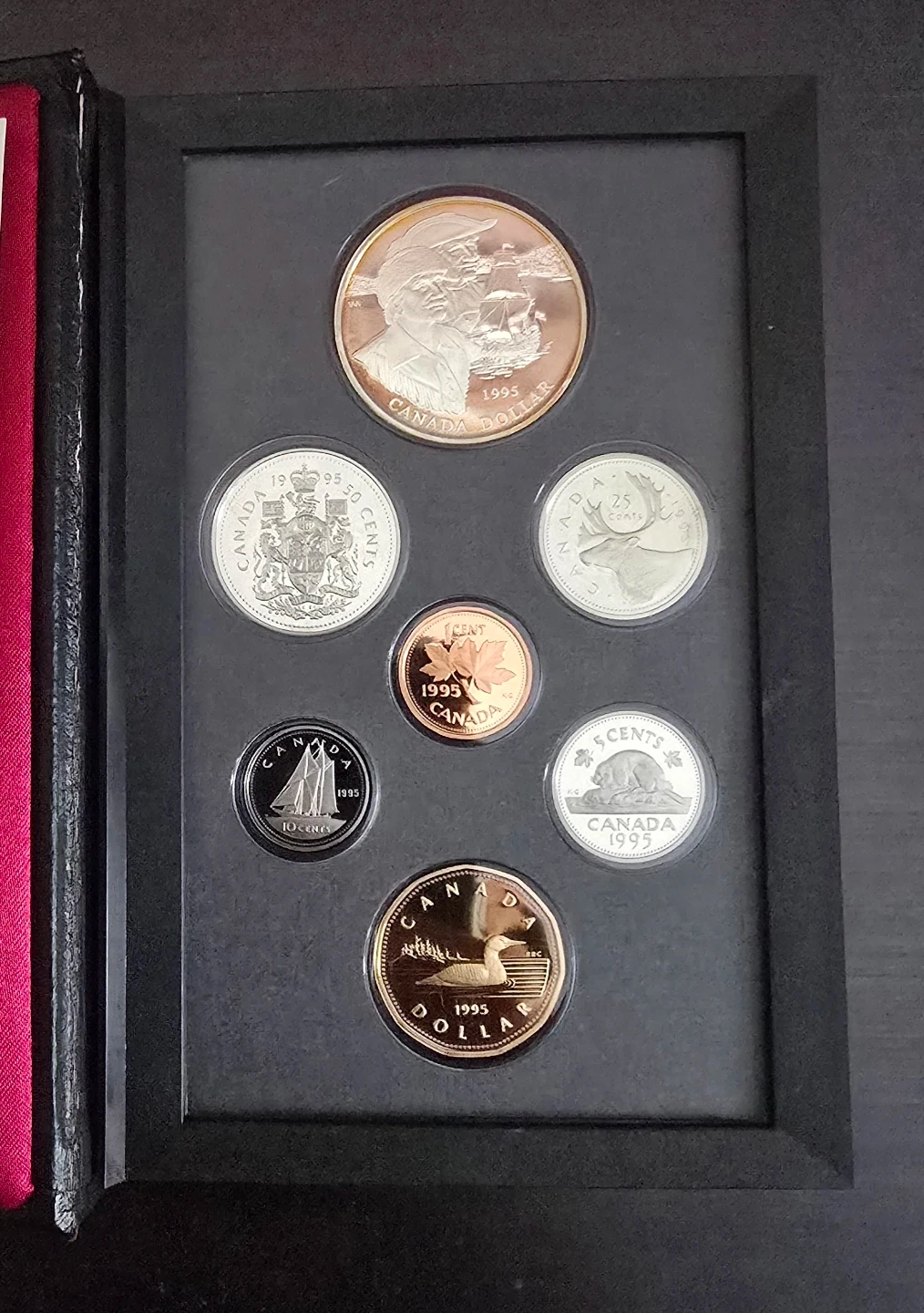 Selling a 1995 Canadian Proof Set. It comes in a black leather case with a maple leaf emblem. The set includes various denominations of Canadian coins from that year, all in proof condition.
