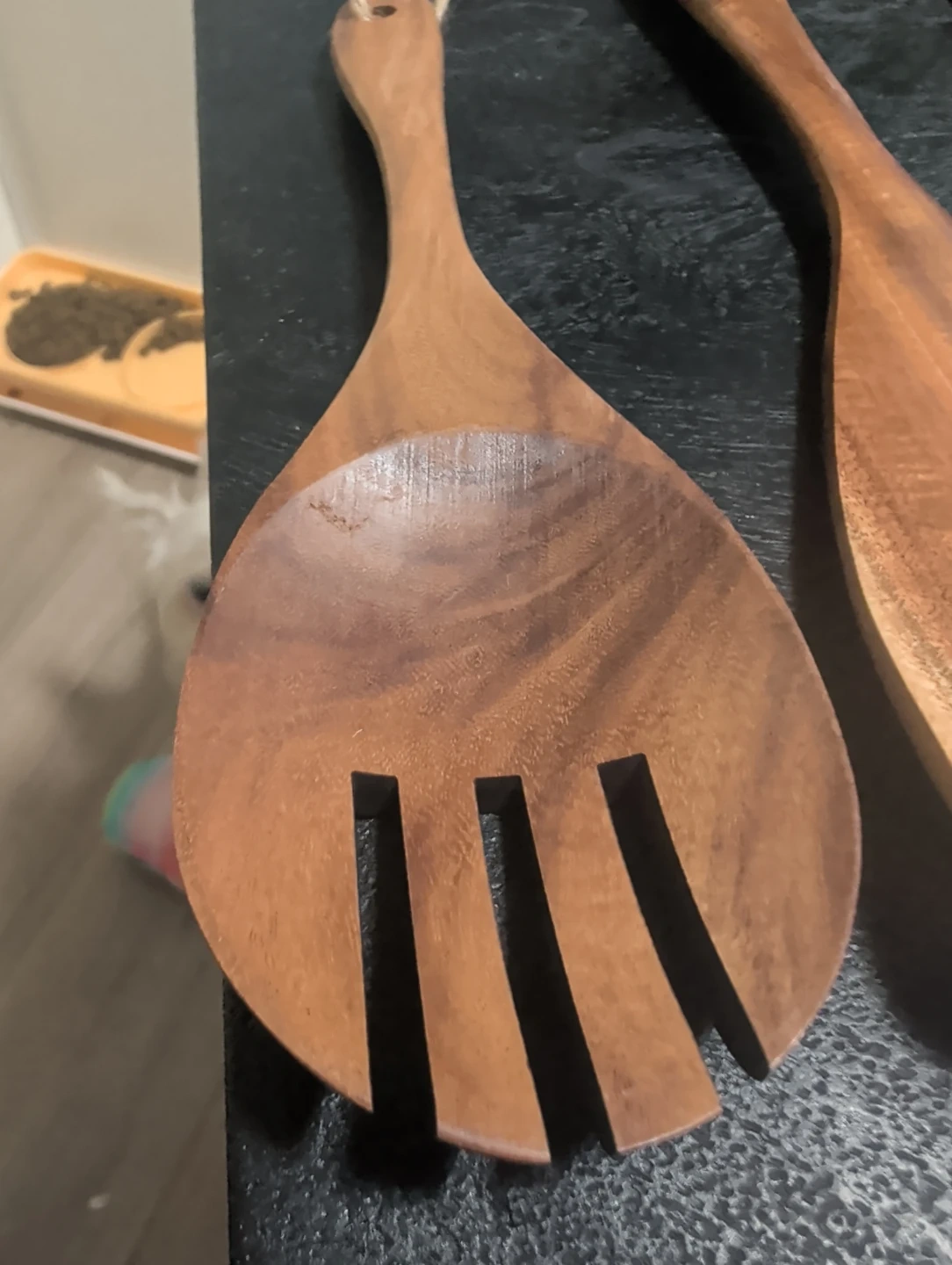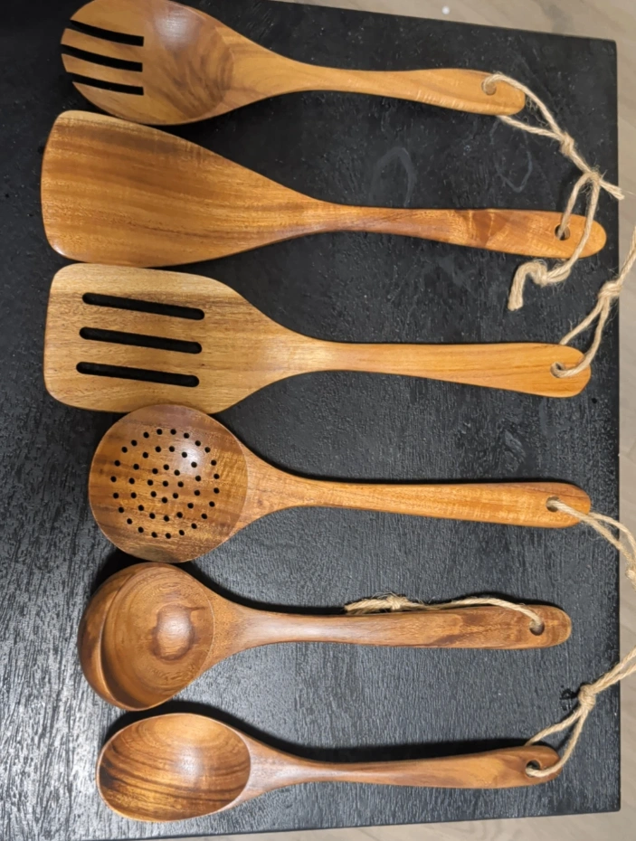Selling a set of six wooden kitchen utensils. They're in great condition and ready for a new kitchen! Includes a variety of spoons and spatulas. It is light weight and great quality. It is perfect for your RV/camping trip or simply for your home kitchen.