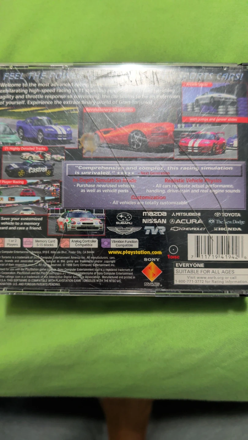 Selling a copy of Gran Turismo for the original PlayStation! It's a Greatest Hits edition. The case has some cracks, but the disc is in good condition and ready to play! Perfect for any retro gaming fan.