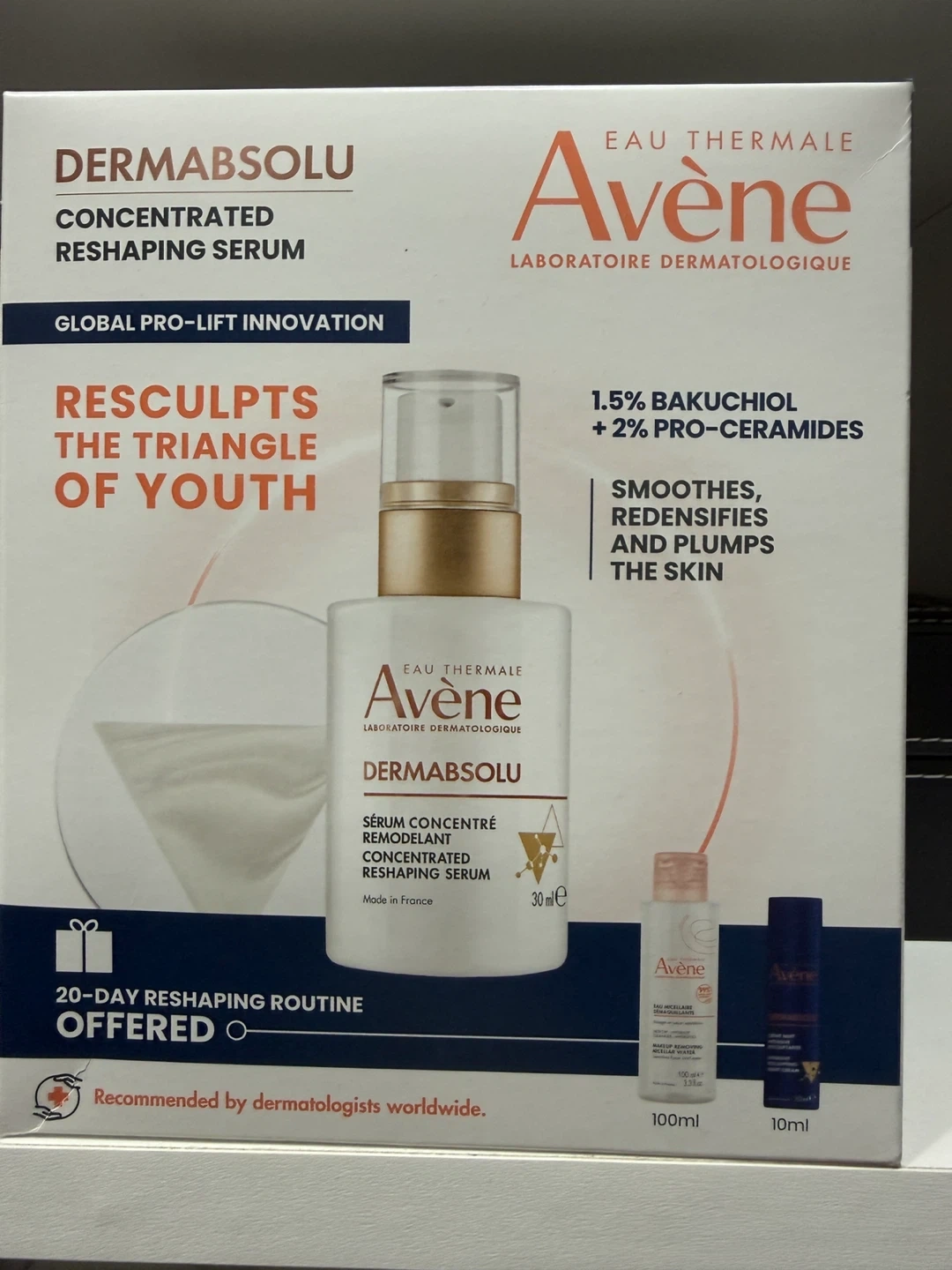 Selling a new Avène DermAbsolu Concentrated Reshaping Serum. This serum is designed to smooth, redensify, and plump the skin with 1.5% Bakuchiol and 2% Pro-Ceramides. It is a concentrated remodelling serum that comes in a 30ml bottle. Recommended by dermatologists worldwide boxed is sealed.