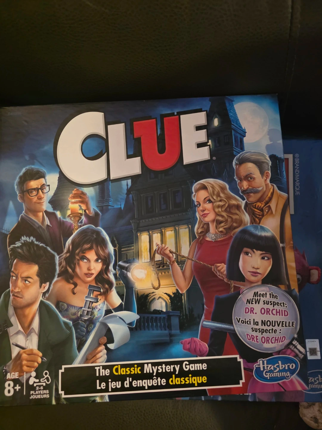 Selling the classic mystery game, Clue, by Hasbro Gaming! The box indicates it's suitable for ages 8+ and for 2-6 players. This edition includes the new suspect, Dr. Orchid!