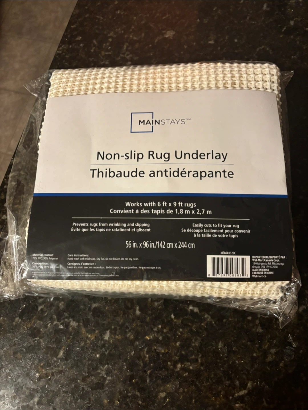 I'm selling a brand new Mainstays non-slip rug underlay! It works with rugs of 6 ft x 9 ft (1.8 m x 2.7 m). It also prevents rugs from wrinkling and slipping. It is easy to cut to fit your rug