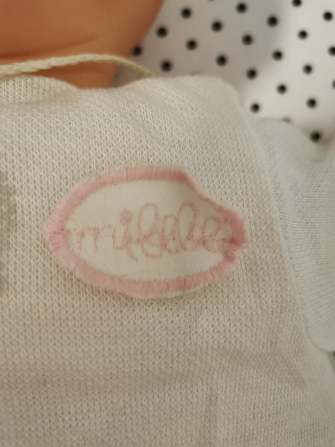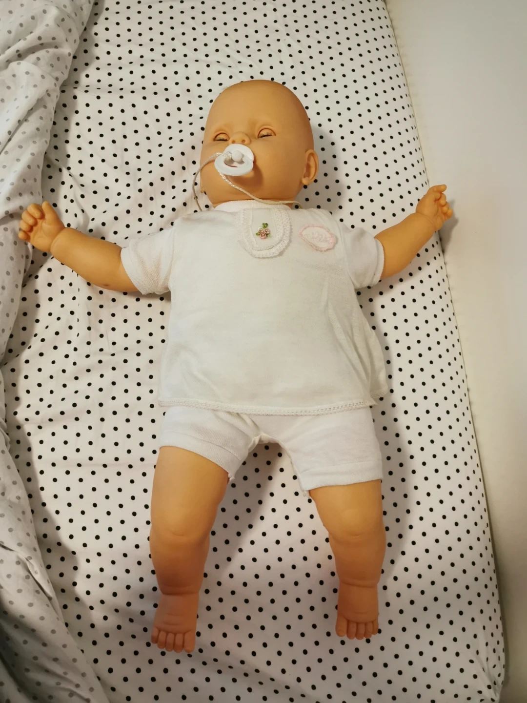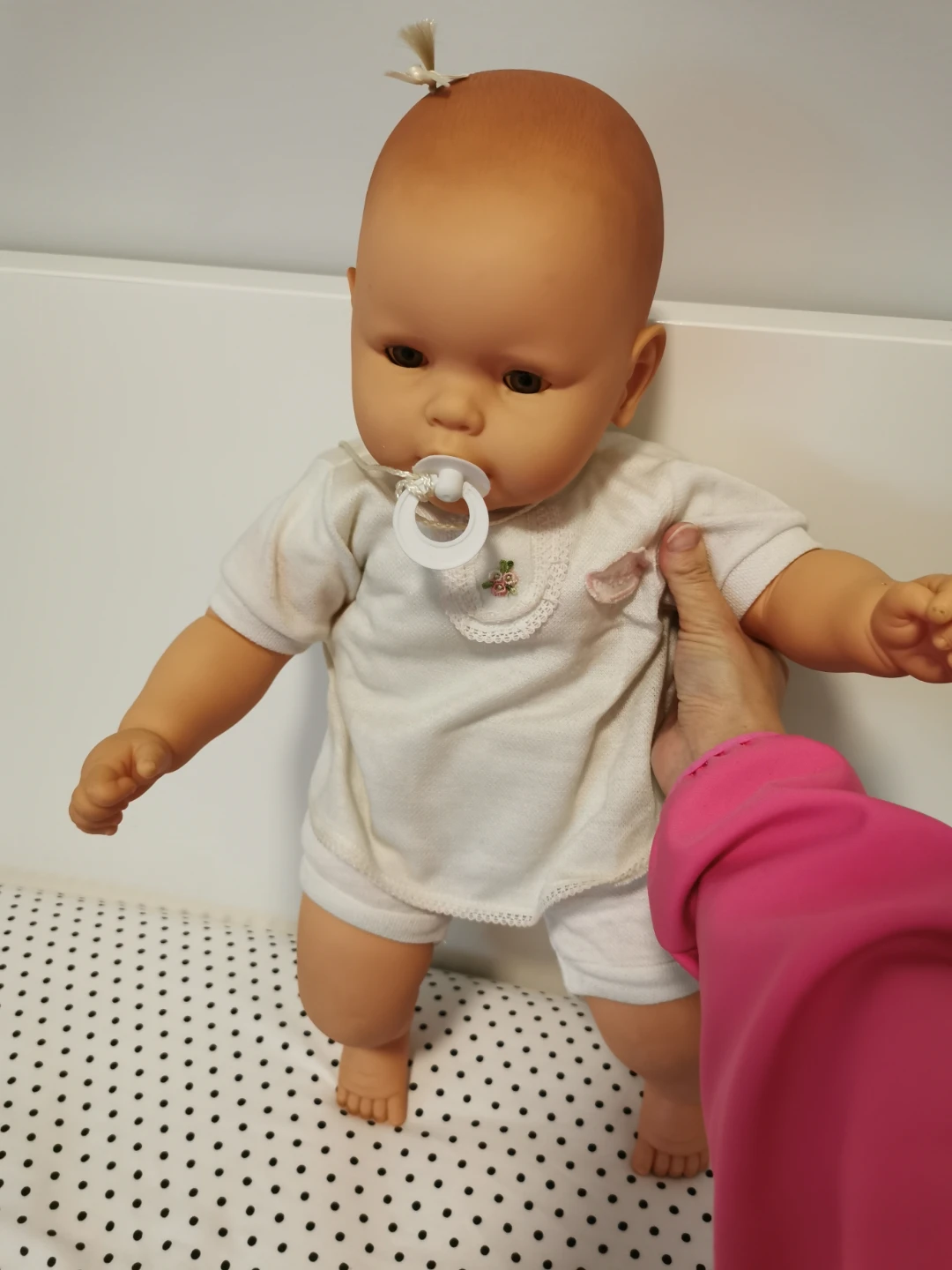This is a Berenguer Hnos. doll named 'Mi bebe'. It is wearing a white outfit and has a pacifier. The doll is in good condition and ready for a new home! 21" tall