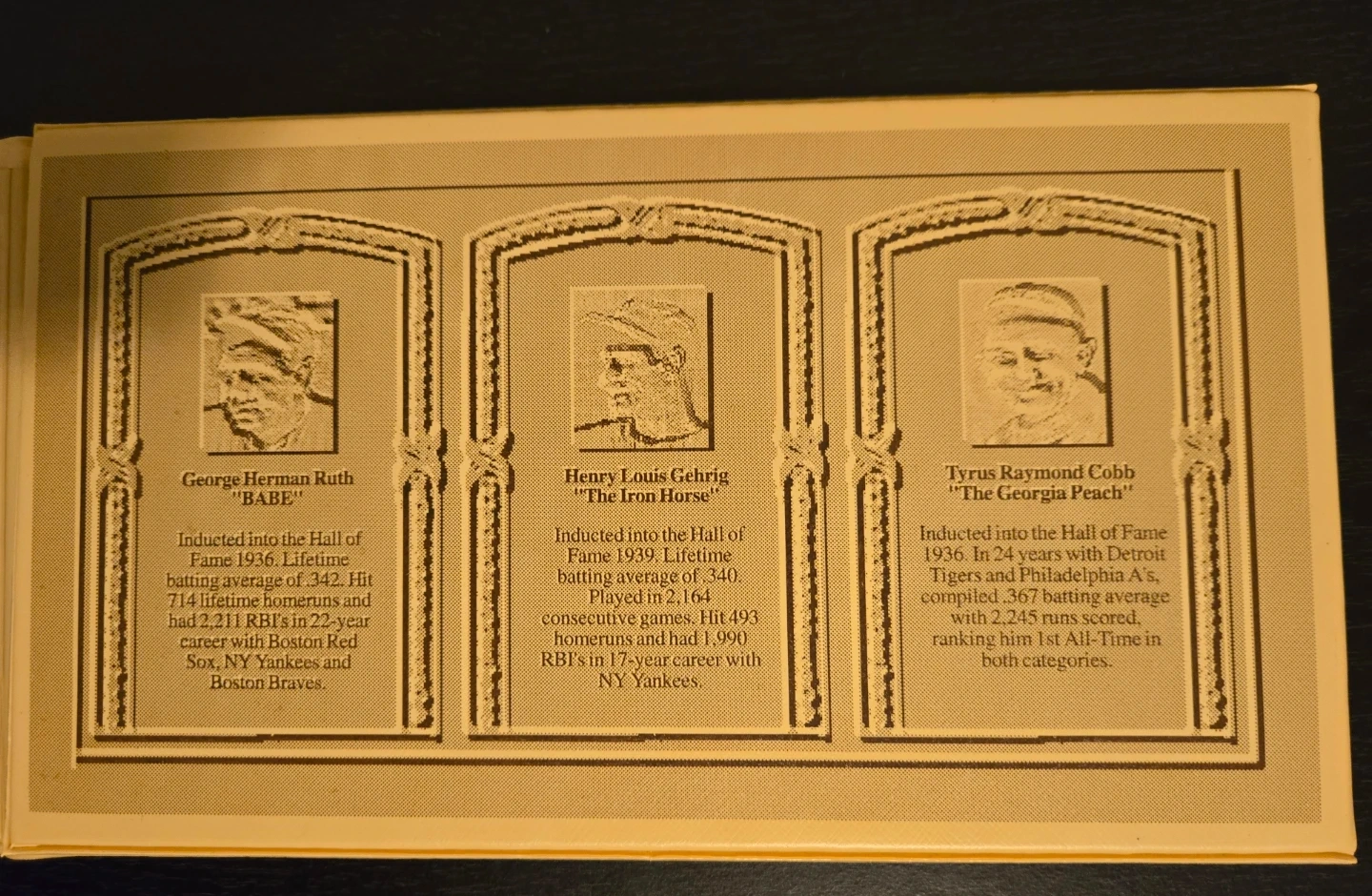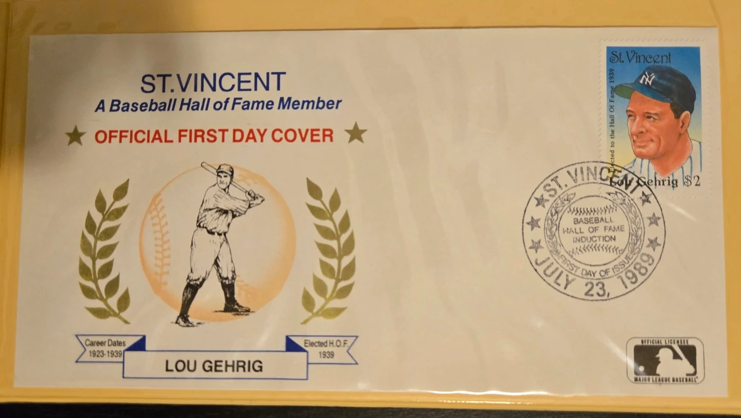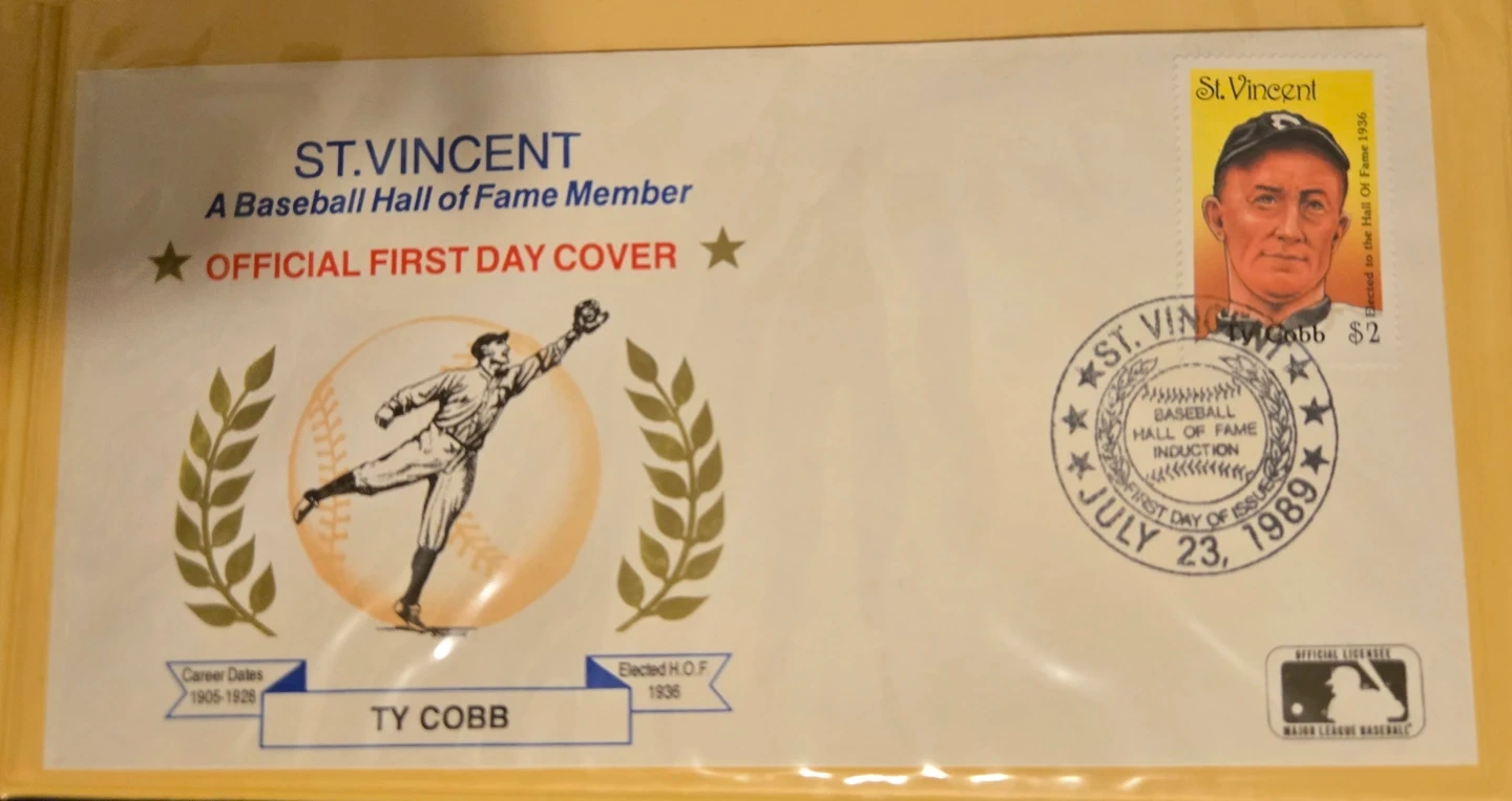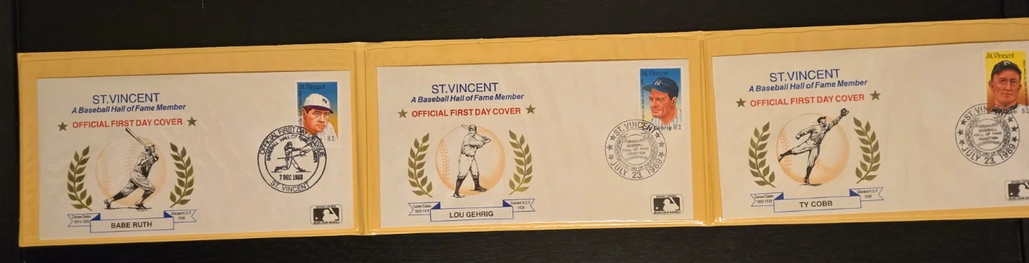 Selling a set of St. Vincent Baseball Hall of Fame 'Official First Day Cover' envelopes featuring Babe Ruth, Lou Gehrig, and Ty Cobb. Each envelope includes a stamp and details about the player's career and Hall of Fame induction. A great collectible for baseball fans! $20 FIRM.