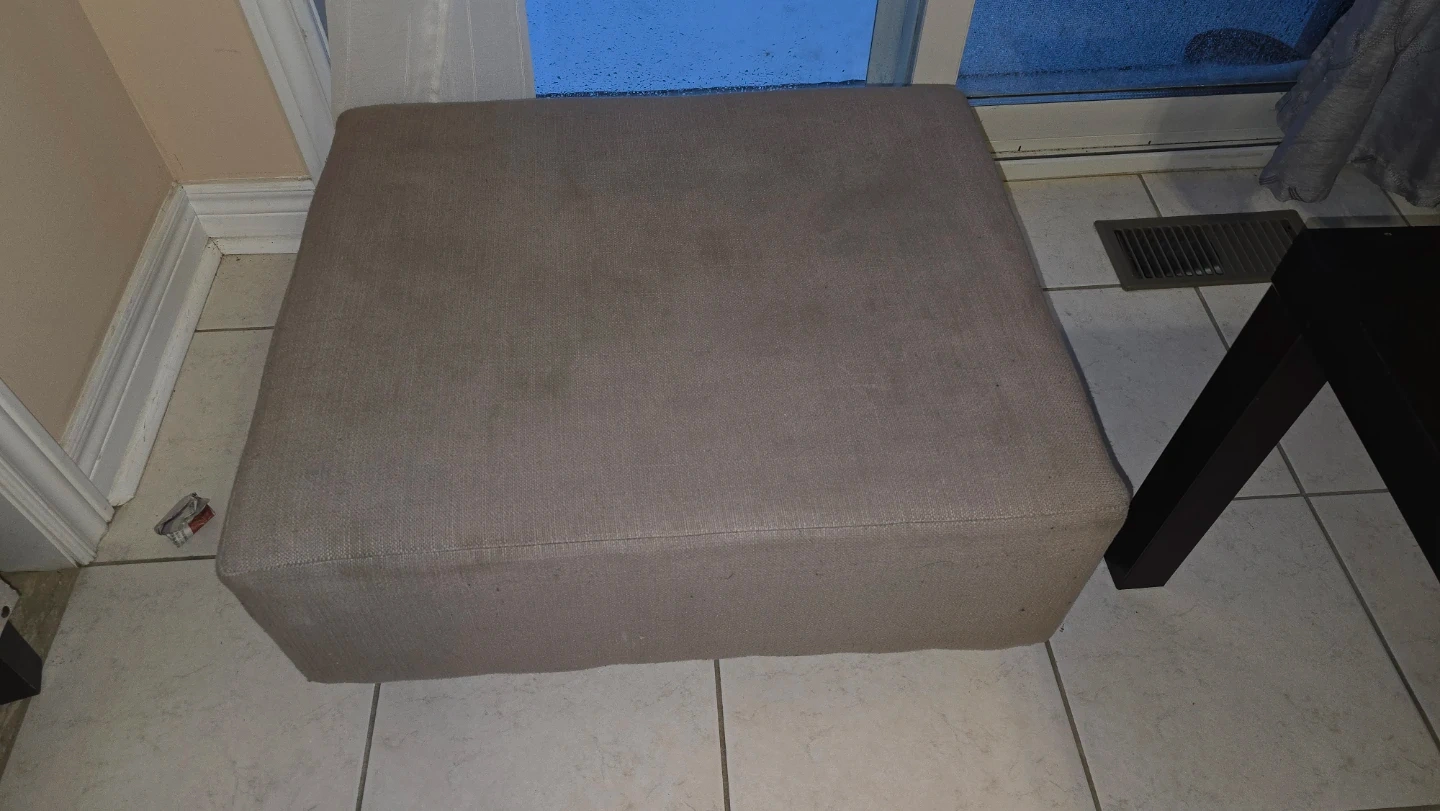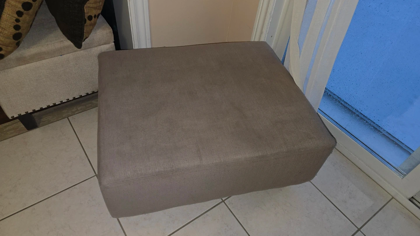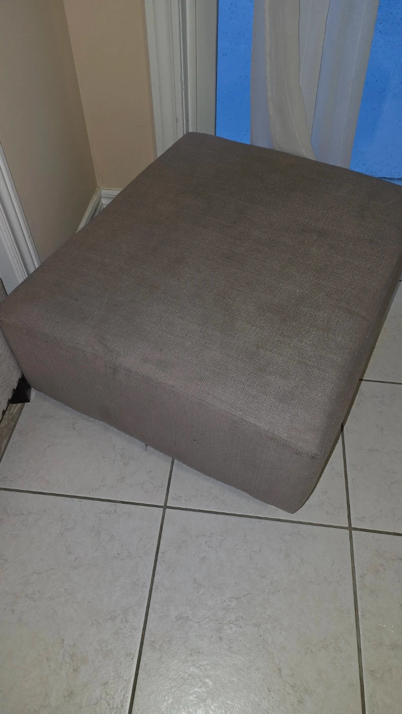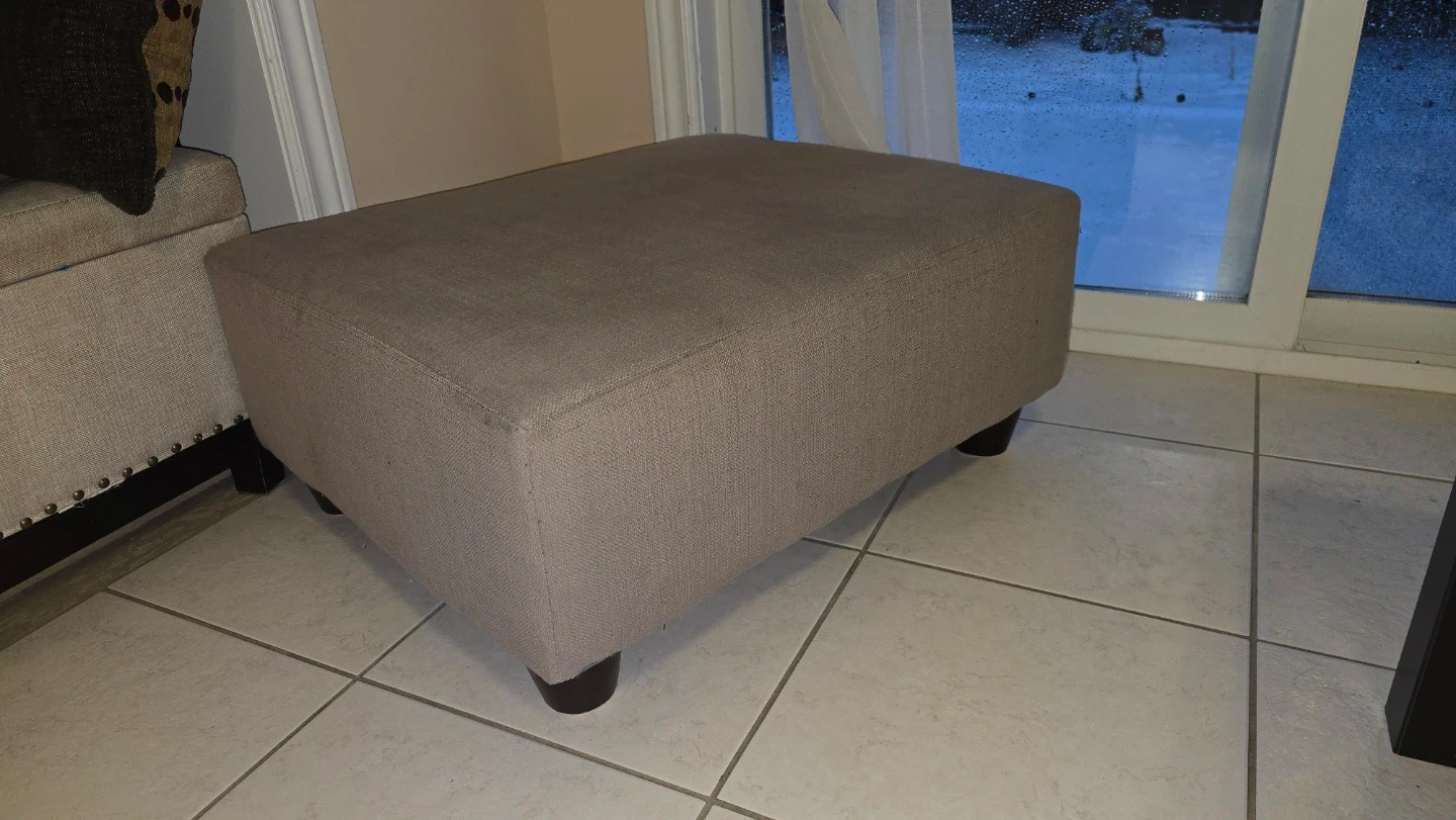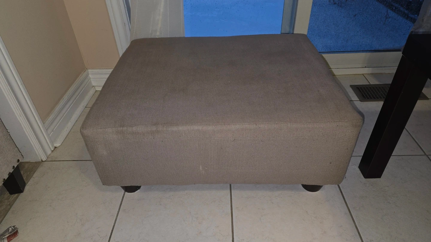 Here's a beige square ottoman that would be good in any living room or bedroom! It's in fair condition and ready for a new home.