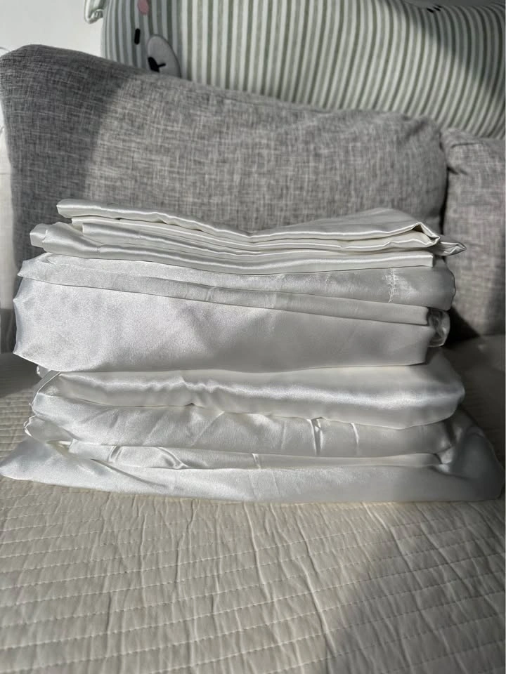 100% Mulberry silk, only lightly used (no stains), not in a hurry to sell - serious buyers only. Purchased from a local store in China. 19 Momme silk.
