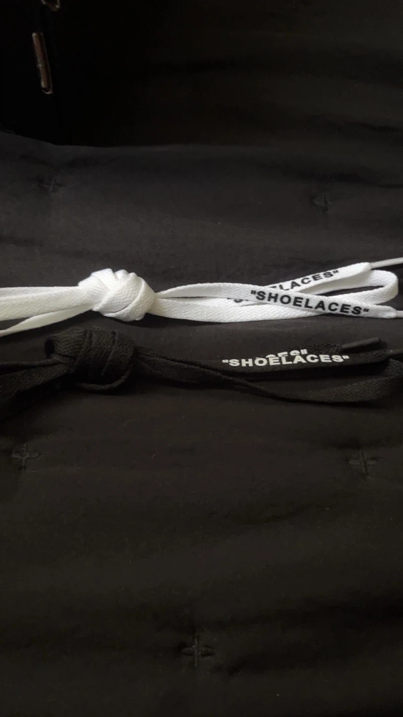 Selling a pair of Off-White shoelaces. One is black and the other is white, both with the signature "SHOELACES" text. They're in great condition and ready to add some style to your shoes
