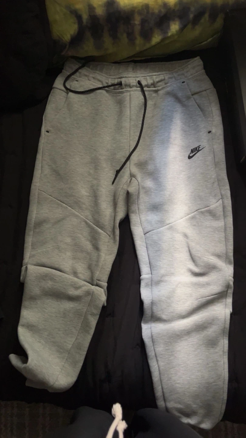 Selling a pair of Nike Tech Fleece pants in grey! They're in great condition and super comfy for lounging or hitting the gym. The Nike logo is visible on the left leg.